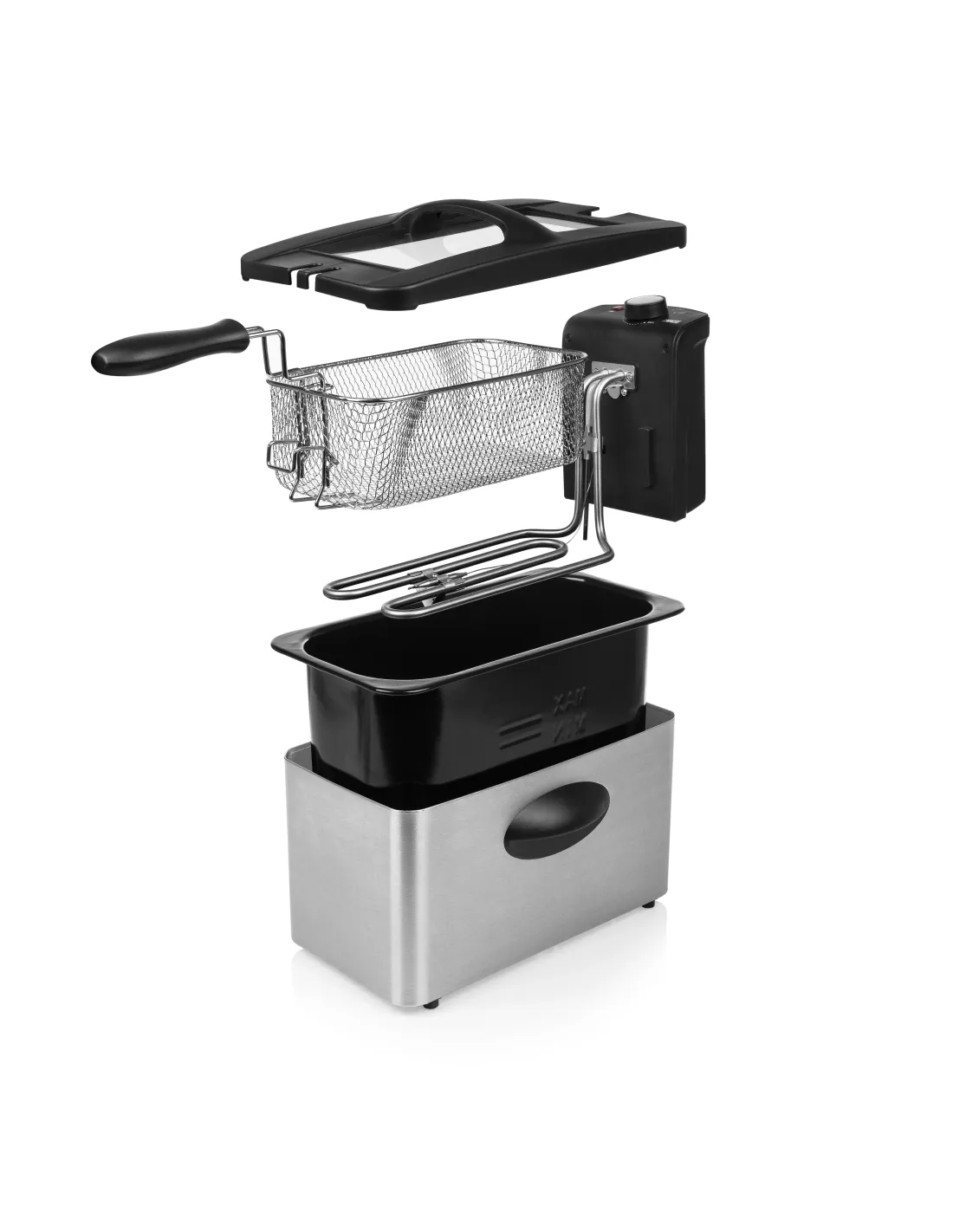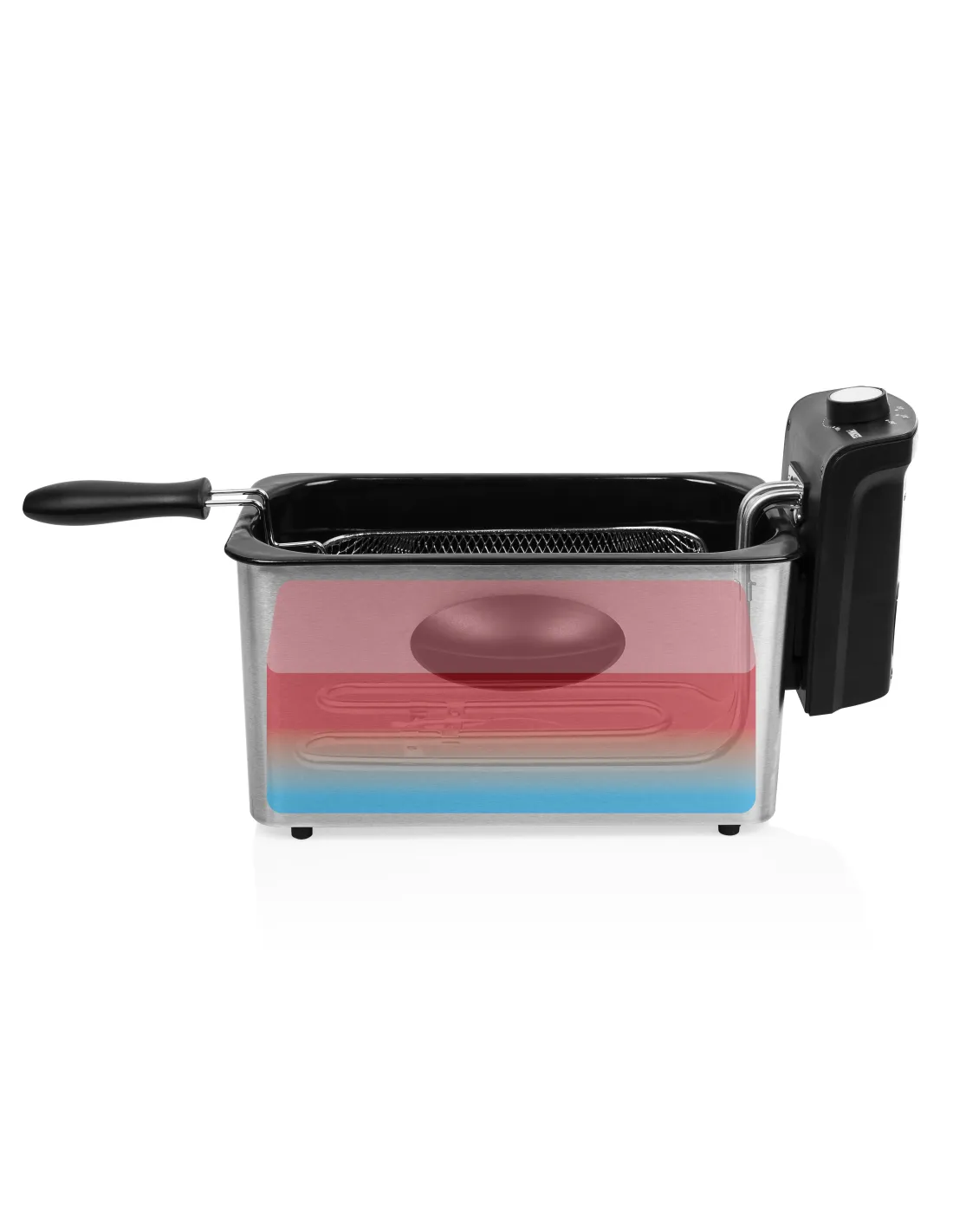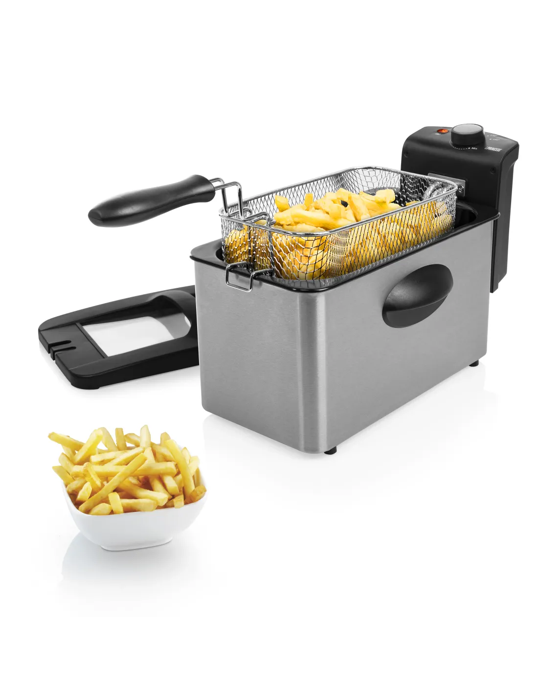 Gran freidora con capacidad de 3 L. Calienta rápidamente gracias a su potencia de 2000 V. Ahora siempre podrá comprobar sus patatas a través del cristal de la tapa.