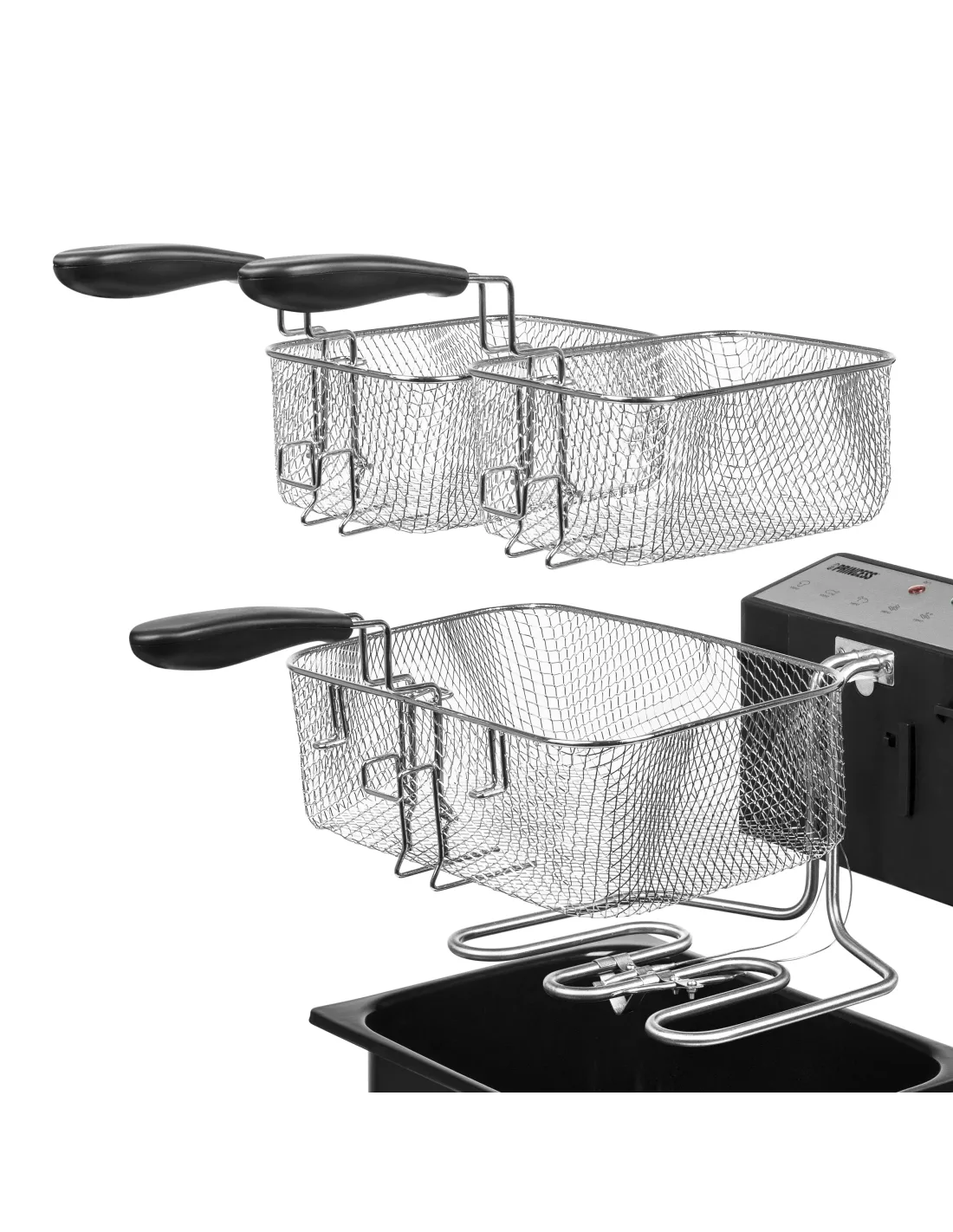 Freidora Princess, 1 cesta grande, 2 cestas medianas, recipiente esmaltado extraíble, manual de instrucciones