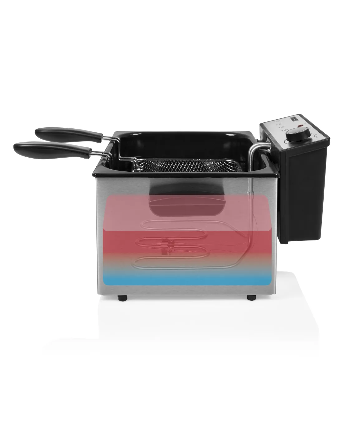 Un problema de muchas freidoras son los residuos que se queman al caerse por la cesta cuando se usa el aceite más de una vez. La freidora Princess cuenta con una zona fría especial para evitar que esto suceda. Todas las partículas pequeñas terminan en la zona fría debajo de la resistencia de calentamiento y, por lo tanto, no se queman. Puede colar los residuos del aceite con el filtro de aceite de seguridad. De esta manera, el aceite permanecerá más limpio durante mucho más tiempo y no terminará con restos negros en las patatas fritas que no son nada saludables.