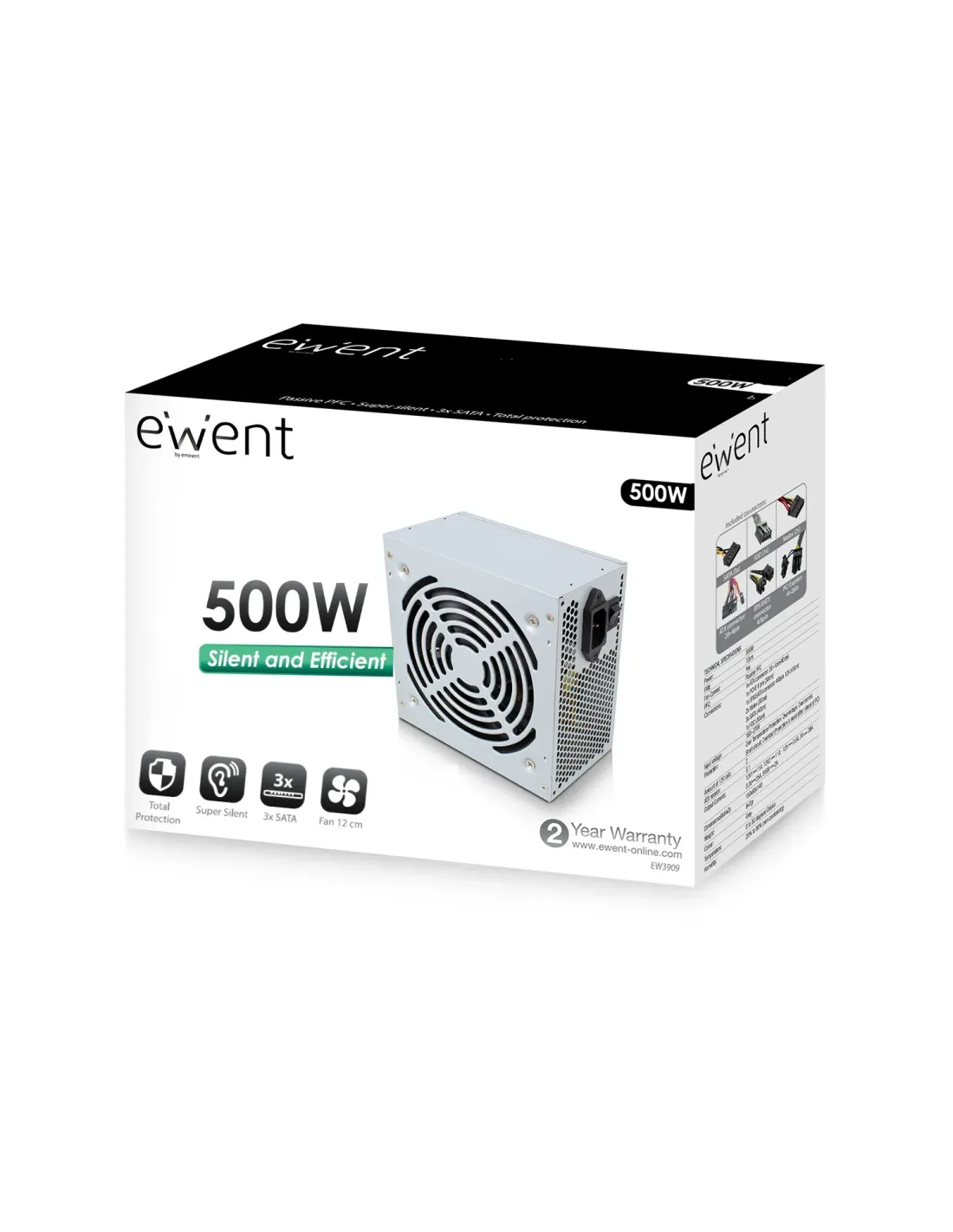 Ewent EW3909. Potencia total: 500 W, Voltaje de entrada AC: 160 - 270 V, Corriente máxima de salida (+3.3V): 6 A. Alimentador de energía para tarjeta madre: 20+4 pin ATX, Longitud del cable de alimentación de la placa base: 40 cm, Longitud del cable de alimentación SATA: 400 mm. Utilizar con: PC, Factor de forma de fuente de alimentación (PSU): ATX. Color del producto: Gris, Tipo de enfriamiento: Activo, Diámetro de ventilador: 12 cm. Certificados de conformidad: CE, REACH, Certificación: IEC62321:2013 EN 55032:2015 EN 61000-3-2:2014 EN 61000-3-3:2013 EN 55024:2010+A1:2015 EN...