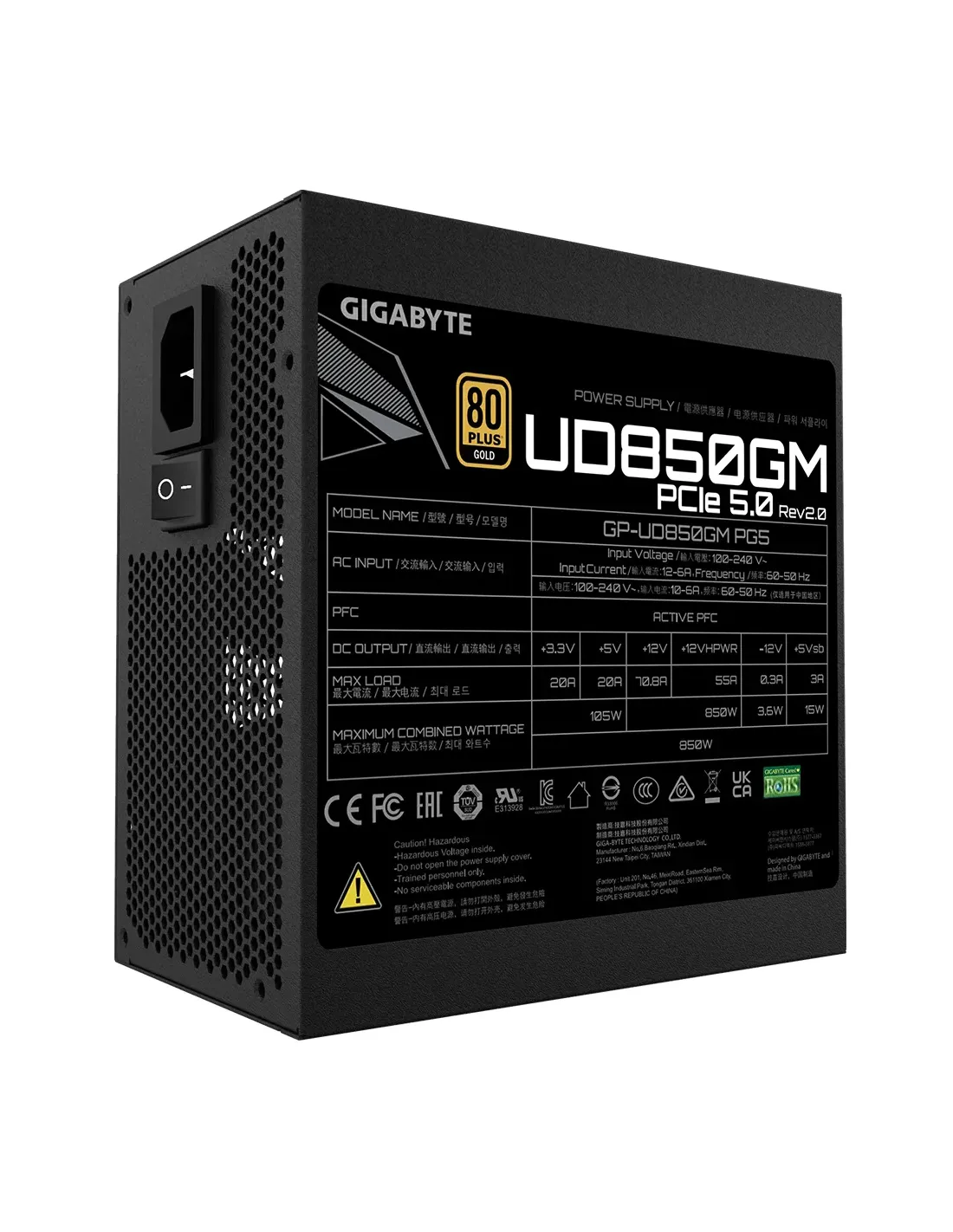 GIGABYTE UD850GM PG5 V2 Fuente de Alimentación – PCIe Gen 5.1, 80 PLUS Gold, Diseño completamente modular, Ventilador de 120 mm, Compatible con ATX 3.1, Enchufe EU, 850 W, 100 - 240 V, 50/60 Hz, 12 - 6 A, Activo, 105 W