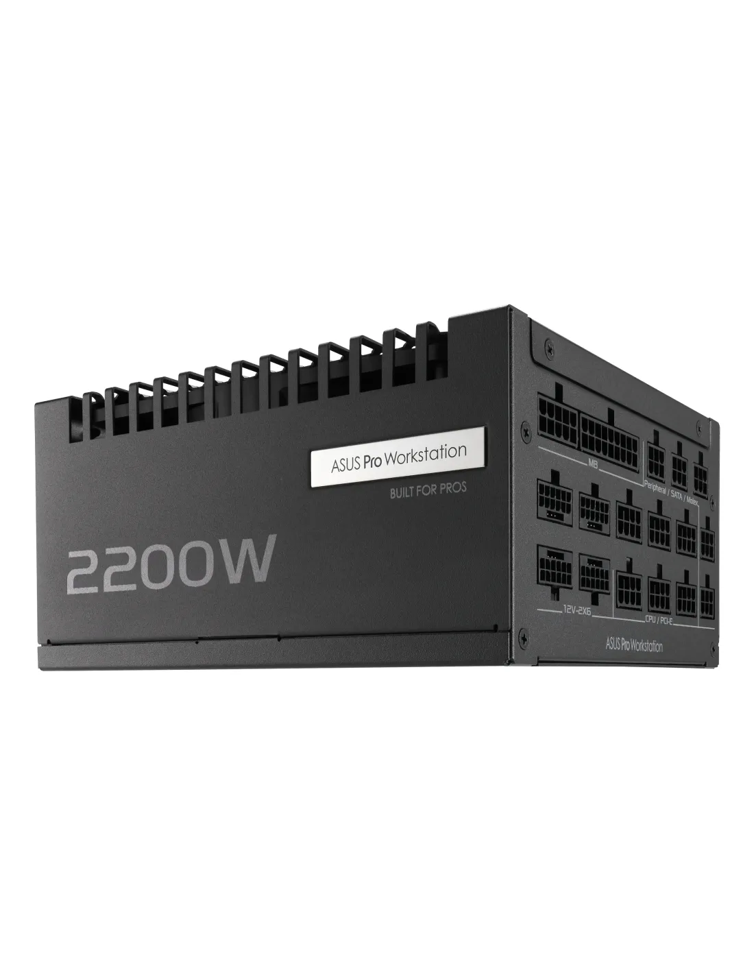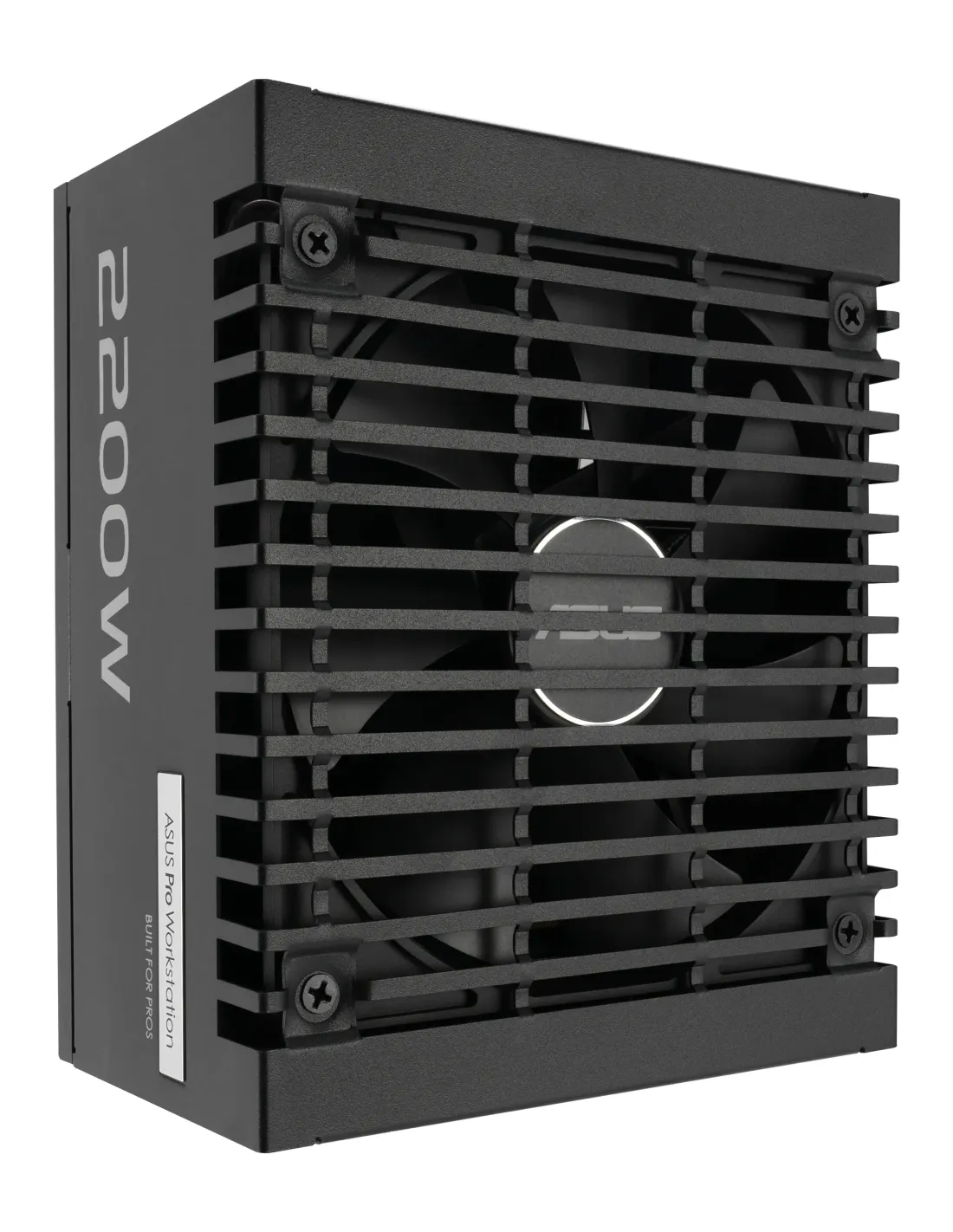 La fuente de alimentación ASUS Pro WS 2200W Platinum ofrece una estabilidad de voltaje excepcional y un suministro de energía avanzado para profesionales, compatible con hasta cuatro tarjetas gráficas para satisfacer las exigentes cargas de trabajo de IA.