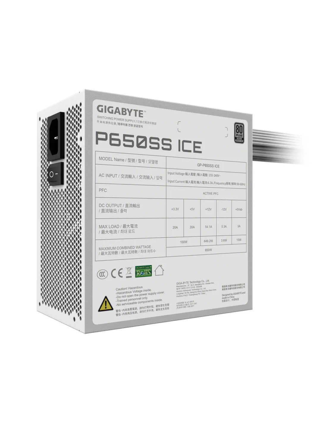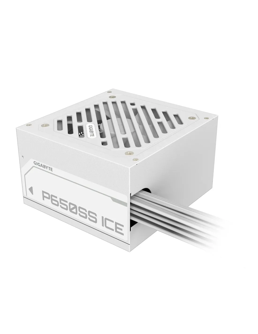 GIGABYTE P650SS ICE Fuente de Alimentación - PCIe 5.0, 80 PLUS Silver, Ventilador de 120 mm, Compatible con ATX 3.0, Enchufe EU. Potencia total: 650 W, Voltaje de entrada AC: 155-240 V, Frecuencia de entrada AC: 50/60 Hz. Alimentador de energía para tarjeta madre: 20+4 pin ATX, Longitud del cable de alimentación de la placa base: 60 cm, Longitud del cable de alimentación SATA: 120,500 mm. Utilizar con: PC, Factor de forma de fuente de alimentación (PSU): ATX, Certificación 80 PLUS: 80 PLUS Silver. Color del producto: Blanco, Tipo de enfriamiento: Activo, Diámetro de ventilador: 12 cm. Ancho: 140 mm, Profundidad: 150 mm, Altura: 86 mm