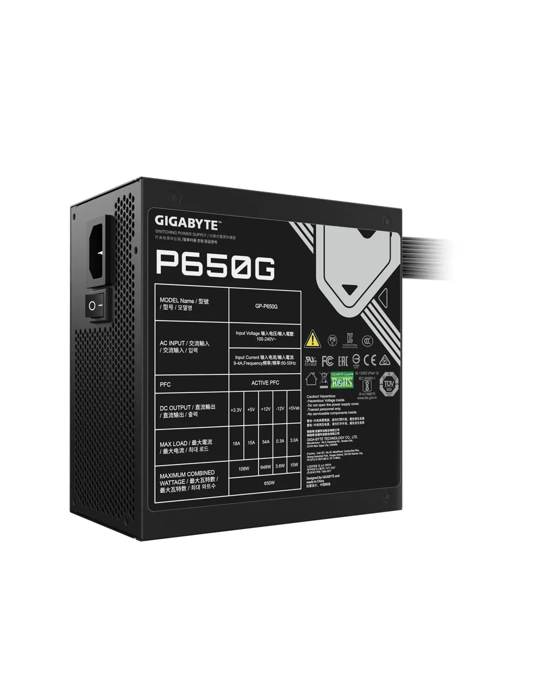 GIGABYTE GP-P650G, 650 W, 100 - 240 V, 12 - 6 A, 12 A, 6 A, Activo