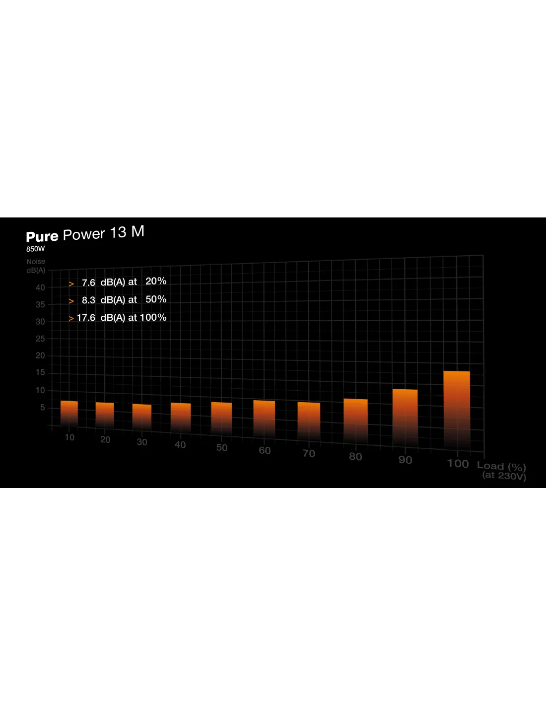 be quiet! Pure Power 13 M | 850W. Potencia total: 850 W, Voltaje de entrada AC: 100 - 240 V, Máxima energía: 900 W. Alimentador de energía para tarjeta madre: 20+4 pin ATX, Longitud del cable de alimentación de la placa base: 55 cm, Longitud del cable de alimentación SATA: 500,650,800,950 mm. Utilizar con: PC, Factor de forma de fuente de alimentación (PSU): ATX, Certificación 80 PLUS: 80 PLUS Gold. Color del producto: Negro, Tipo de enfriamiento: Activo, Diámetro de ventilador: 12 cm. Cables incluidos: Corriente alterna, CPU, PCIe, Peripheral (Molex), SATA