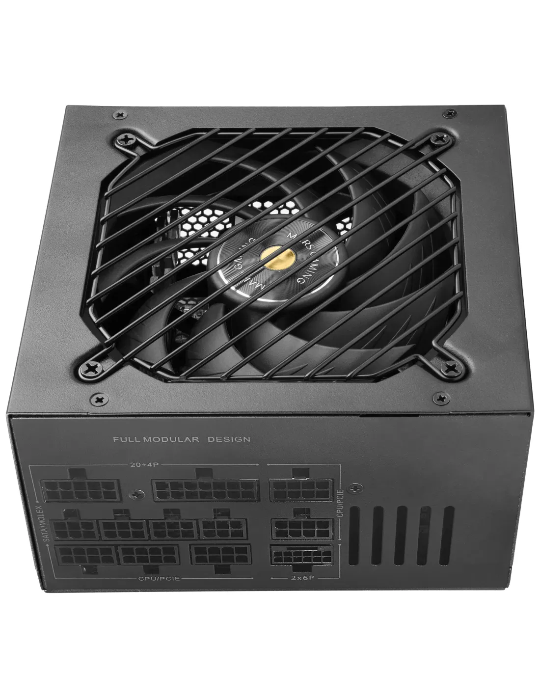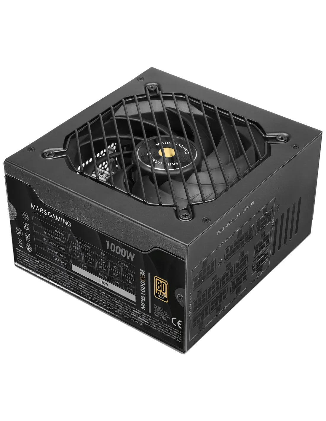Mars Gaming MPB1000SIM. Potencia total: 1000 W, Voltaje de entrada AC: 220 - 240 V, Frecuencia de entrada AC: 47 - 63 Hz. Alimentador de energía para tarjeta madre: 24-pin ATX, Tipo de cableado: Totalmente modular. Utilizar con: PC, Factor de forma de fuente de alimentación (PSU): ATX, Certificación 80 PLUS: 80 PLUS Gold. Color del producto: Negro, Tipo de enfriamiento: Activo, Diámetro de ventilador: 14 cm. Cables incluidos: CPU, PCIe, Peripheral (Molex), SATA