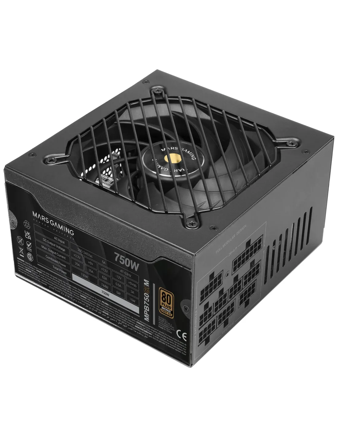 Mars Gaming MPB750SIM. Potencia total: 750 W, Voltaje de entrada AC: 220 - 240 V, Frecuencia de entrada AC: 47 - 63 Hz. Alimentador de energía para tarjeta madre: 24-pin ATX, Tipo de cableado: Totalmente modular. Utilizar con: PC, Factor de forma de fuente de alimentación (PSU): ATX, Certificación 80 PLUS: 80 PLUS Bronze. Color del producto: Negro, Tipo de enfriamiento: Activo, Diámetro de ventilador: 14 cm. Certificados de conformidad: CE, RoHS