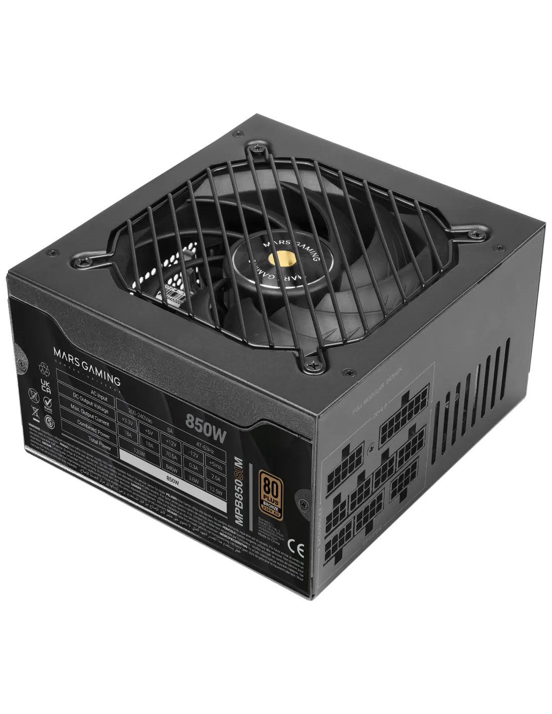 Mars Gaming MPB850SIM. Potencia total: 850 W, Voltaje de entrada AC: 200 - 240 V, Frecuencia de entrada AC: 47 - 63 Hz. Alimentador de energía para tarjeta madre: 24-pin ATX, Tipo de cableado: Totalmente modular. Utilizar con: PC, Factor de forma de fuente de alimentación (PSU): ATX, Certificación 80 PLUS: 80 PLUS Bronze. Color del producto: Negro, Tipo de enfriamiento: Activo, Diámetro de ventilador: 14 cm. Certificados de conformidad: CE, RoHS
