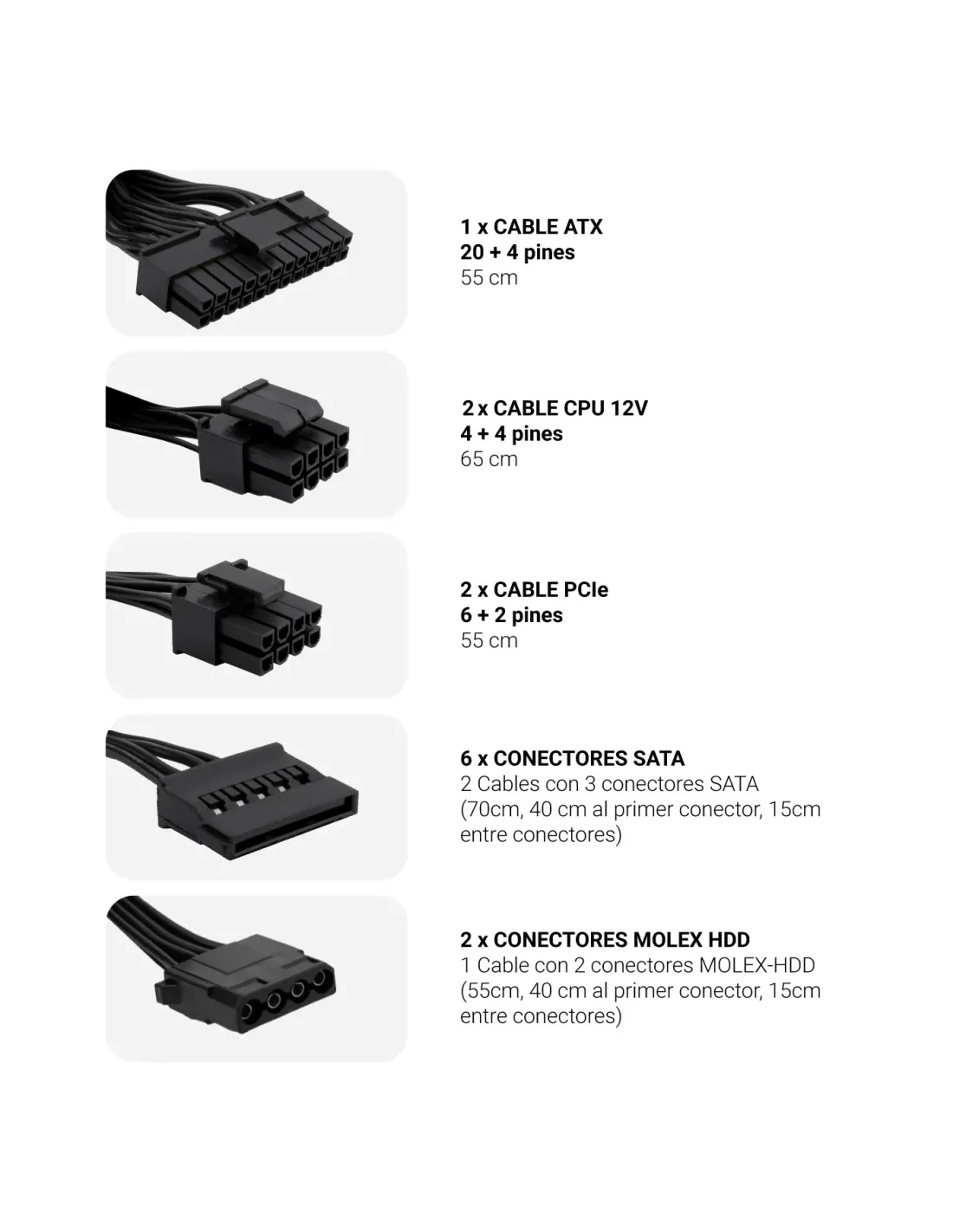 En formato ATX, diseñadas conforme a la especificación Intel ATX12V y disponibles en versiones de diferentes potencias, las fuentes CoolBox PowerLine 3 destacan por su calidad, fiabilidad y eficiencia del 85% (al 50% de carga).Con chasis de color negro y cables planos para facilitar el montaje y mejorar la circulación del aire en el interior del PC, cuentan con un ventilador silencioso de 120mm. Marca Coolbox Modelo COO-FAPW3-850 Características - Tipo: ATX 12V - Potencia: 850W - Eficiencia: 85% (al 50% de carga), ≥ 80% (al 100% de carga) - Especificación: conforme a especificación Intel ATX12V - Tecnología: tecnología de conversión DC-DC para una máxima eficiencia y estabilidad - Filtro: 1 x filtro de grado EMI - Ventilador: ventilador silencioso de 120mm con velocidad regulable (termorregulado) - PFC: activo (>0.9) - Protecciones: OPP / OVP / UVP / SCP - Tiempo de espera: >16ms - Señal PG: 100-500ms - MTBF: > 60.000 Horas - Condiciones ambientales de uso: temperatura: 0 ~ 50ºC, humedad 20% ~ 90% sin condensación Conectores - 1 x Conector principal ATX 20+4 pines - 1 x Conector 12V 8 pines (4+4) - 2 x Conector PCIe 6+2 pines - 4 x Conector de alimentación SATA - 2 x Conector Molex HDD Dimensiones y peso - 150 x 140 x 86 mm - 1,225 kg Fecha de revisión 20-01-2025 por RTY