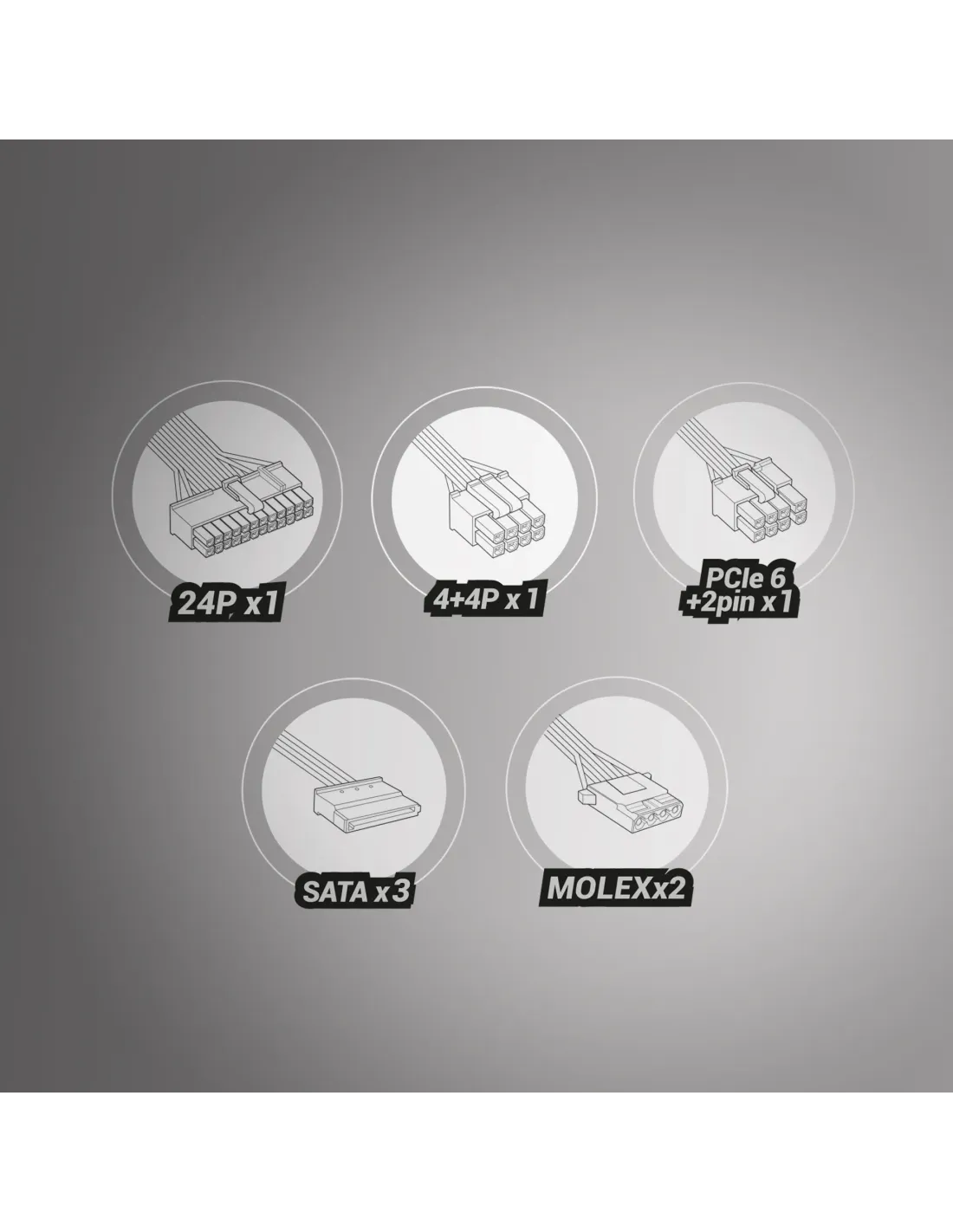 - PUERTOS E INTERFACES Corriente máxima de entrada: 5A Voltaje de entrada: 200-240V 50/60Hz Voltaje/Corriente de salida: +3.3V - 18A +5V - 18A +12V - 45.5A -12V - 0.3A +5VSB - 2.5A Corrección del factor de potencia tipo PFC: Activo Conectores: 1x ATX MB 24 PIN 1x EPS +12V 4+4 PIN 1x PCIe 6+2 PIN 3x SATA 2x Molex 4 PIN - PESO Y DIMENSIONES Ancho: 150mm Profundidad: 160mm Altura: 85mm Peso: 1350g - ENFRIAMIENTO Número de ventiladores: 1 Diámetro de ventilador: 14cm - DISEÑO Color: Negro Tipo de cableado: Fijo Cableado: Cables planos extra largos Extras: Proceso de fabricación SMD / Tecnología DC-DC - DESEMPEÑO Uso: PC Factor de forma de fuente de alimentación (PSU): ATX Potencia: 550W Eficiencia: 87% Nivel de ruido: 12dB Certificaciones: ATX12V, CE, ROHS, TUV Protecciones: OPP (Protección contra sobrepotencia) OVP (Protección contra sobrevoltaje) UVP (Protección contra bajo voltaje) SCP (Protección contra cortocircuitos) OCP (Protección contra sobrecorriente) OTP (Protección contra sobretemperatura) OLP (Protección contra sobrecarga) SCP (Protección contra cortocircuitos) NLO (Protección contra ausencia de carga) PFP (Protección contra fluctuaciones de potencia) TCP (Protección térmica contra sobrecalentamiento)