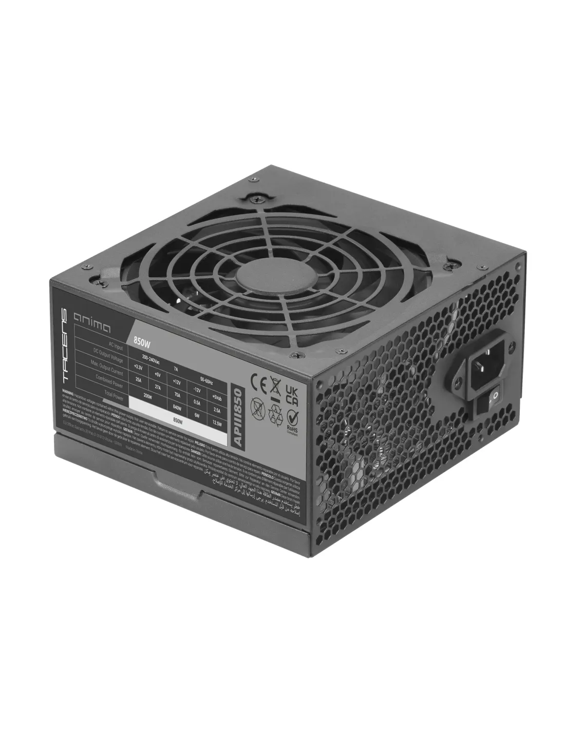 Eficiencia 85% nivel bronce. Tecnología SMDLa fuente de alimentación APIII850, con 850W y fabricada con con componentes de alta calidad y fiabilidad mediante la última tecnología de fabricación SMD, tecnología de rail único de 12V y componentes en PCB de fibra de vidrio de doble capa, alcanza un nivel de eficiencia Bronze del 85%.Seguridad total. Calidad europeaMáxima protección eléctrica gracias a su completo sistema de protección electrónicos OPP/OVP/UVP/SCP. Diseñada y desarrollada en Europa, la fuente APIII850 ha sido fabricada conforme a las directivas y normas exigidas por la Unión Europea garantizando un perfecto funcionamiento y calidad certificada por el reconocido laboratorio de calidad y seguridad TÜV Rheinland.Tecnología avanzada de conversión DC-DCLa tecnología de conversión DC-DC optimiza la eficiencia y asegura una estabilidad y adaptabilidad excepcionales, con regulación de voltaje para proteger los componentes más sensibles. Incluso ante variaciones de carga, esta fuente de alimentación ATX mantiene un rendimiento óptimo, garantizando la estabilidad del equipo en cualquier situación.Silencio TotalLa fuente de alimentación integra un ventilador de 120mm ultra-silencioso con control inteligente de velocidad y sistema anti-vibración que garantiza un flujo de aire efectivo y un funcionamiento silencioso.Cables y carcasa full blackLa APIII850 está fabricada con un acabado completamente en negro con unos cables largos, negros y planos de alta calidad diseñados para ofrecer la máxima compatibilidad y una cómoda instalación: 1×24pin, 1x12V 4+4pin, 4xSATA, 2xMOLEX, 2x PCIE 6+2PINTacens Anima APIII850. Potencia total: 850 W, Voltaje de entrada AC: 200 - 240 V, Frecuencia de entrada AC: 50/60 Hz. Alimentador de energía para tarjeta madre: 24-pin ATX, Tipo de cableado: No modular. Utilizar con: PC, Factor de forma de fuente de alimentación (PSU): ATX, Certificación 80 PLUS: 80 PLUS Bronze. Color del producto: Negro, Tipo de enfriamiento: Activo, Diámetro de ventilador: 12 cm. Ancho: 150 mm, Profundidad: 145 mm, Altura: 85 mmControl de energíaPotencia total850 WVoltaje de entrada AC200 - 240 VFrecuencia de entrada AC50/60 HzCorriente de entrada7 ACorrección del factor de potencia tipo (PFC)ActivoPotencia combinada (3,3 V)200 WPotencia combinada (+12 V)720 WPotencia combinada (+5 V)200 WPotencia combinada (-12V)6 WPotencia combinada (+5 VSB)12,5 WCorriente máxima de salida (+3.3V)24 ACorriente máxima de salida (+12V)60 ACorriente máxima de salida (+5V)27 ACorriente máxima de salida (-12V)0,5 ACorriente máxima de salida (+5Vsb)2,5 AEficiencia85%Funciones de protección de poderSobreintensidad, Sobretensión, Sobrevoltaje, Cortocircuito, Bajo voltajePuertos e InterfacesAlimentador de energía para tarjeta madre24-pin ATXNúmero de conectores de energía SATA4Conectores de poder (4 pin) periferales (Molex)2Conectores de poder PCI Express (6 + 2 pin)2CPU conector de alimentación (4 +4 pines)SiConector de potencia ATX (24 pines)SiTipo de cableadoNo modularDesempeñoUtilizar conPCFactor de forma de fuente de alimentación (PSU)ATXCertificación 80 PLUS80 PLUS BronzeNivel de ruido14 dBDiseñoColor del productoNegroTipo de enfriamientoActivoDiámetro de ventilador12 cmNúmero de ventiladores1 Ventilador(es)Ubicación de ventiladorSuperiorIluminaciónNoInterruptor de encendido/apagado integradoSiPeso y dimensionesAncho150 mmProfundidad145 mmAltura85 mmPeso1,35 kgEmpaquetadoTipo de embalajeCaja