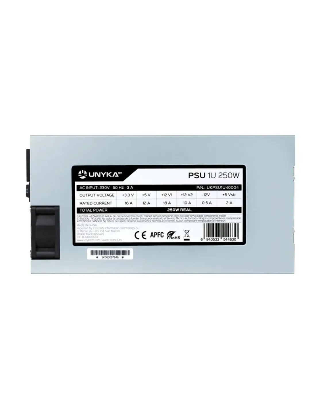 Características de la Fuente de Alimentación UNYKAch FLEX 1U 250W APFCLa fuente de alimentación UNYKAch FLEX 1U de 250W está diseñada específicamente para entornos de servidor y equipos de red que requieren formato compacto y alto rendimiento. Su diseño en formato Flex ATX 1U la convierte en una opción ideal para racks de 19" donde el espacio es limitado. Con PFC activo, refrigeración eficiente y protecciones eléctricas integradas, garantiza estabilidad y fiabilidad en operaciones continuas.Diseño compacto para espacios reducidosGracias a su formato Flex ATX (1U), esta fuente es perfecta para servidores de montaje en rack y sistemas de alta densidad. Sus dimensiones están optimizadas para facilitar la instalación en configuraciones profesionales.Ancho: 100 mmProfundidad: 195 mmAltura: 40 mmPeso: 990 gPotencia estable con corrección activa (APFC)Ofrece una potencia de salida de 250W con sistema de corrección del factor de potencia activo (PFC), lo que mejora la eficiencia energética y reduce la generación de calor. Es ideal para mantener el rendimiento de sistemas críticos de forma continua.Voltaje de entrada: 100 - 230 VFrecuencia: 50 - 60 HzCorriente en +12V1: 18 A / +12V2: 10 APFC: ActivoRefrigeración eficiente y silenciosaEquipada con un ventilador trasero de 40 mm que opera entre 0 y 1000 RPM, asegura una refrigeración constante sin exceso de ruido. Esto ayuda a mantener una temperatura operativa segura para todos los componentes.Diámetro del ventilador: 4 cmUbicación: Parte traseraVelocidad: 0 - 1000 RPMProtección eléctrica completaIncluye un sistema de protecciones eléctricas integradas que garantizan la seguridad del sistema ante situaciones de sobrecarga o fallos. Diseñada para un funcionamiento seguro incluso en condiciones exigentes.Protección contra sobreintensidadProtección contra sobretensión y bajo voltajeProtección contra cortocircuitoConectividad completa para sistemas de servidorOfrece una amplia gama de conectores para asegurar la compatibilidad con placas base, discos y otros dispositivos internos. Todos los cables son de tipo no modular, con longitudes adecuadas para sistemas compactos.Conector ATX 20+4 pines (placa base)2 x Molex (periféricos) / Longitudes: 710 mm y 560 mm3 x SATA / Longitudes: 400, 560 y 700 mmConector EPS 4+4 pinesConector Floppy / Longitud: 890 mmConstrucción robusta y certificacionesFabricada con materiales de alta calidad y sometida a estrictos controles de producción. Cumple con normativas internacionales, lo que garantiza su fiabilidad en instalaciones profesionales.Certificaciones: CE, RoHSColor del producto: PlataVersión ATX: 2.3Uso recomendado: ServidorOtras especificacionesCorriente máxima +3.3V: 16 ACorriente máxima -12V: 0.5 ACorriente máxima +5Vsb: 2 A