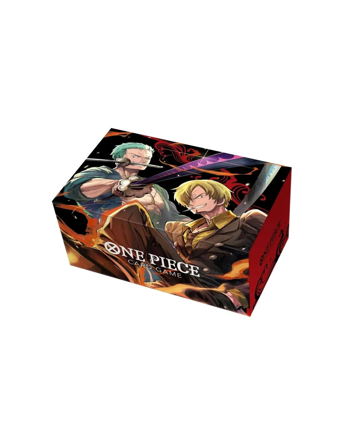 Caja de almacenamiento de cartas hecha de cartón con la imagen de Zoro & Sanji para el juego de cartas coleccionables One Piece Card Game, oficial de Bandai.