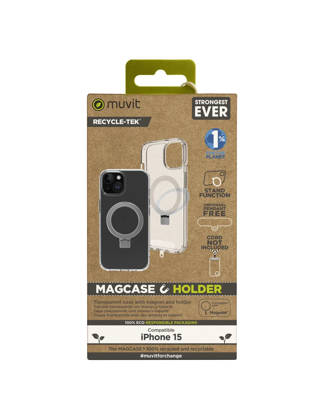 La protección del medio ambiente es, hoy en día, una preocupación en todo momento, junto a la preocupación de proteger nuestro Smartphone. Con las fundas recycletek de muvit for change,proponemos una gama de fundas reciclables, fabricadas con fundas usadas y viejas. Una manera responsable de proteger nuestro smartphone. Porque contribuir en la lucha contra la contaminación yproteger nuestro eco sistema, debe formar parte de nuestros gestos cotidianos.Protege a tu nuevo iPhone 15 y al medio ambiente con las fundas recycletek hechas de material reciclado y reciclable. Además es compatible con Magsafe, por lo que estas fundas permiten sujetar eliPhone al cargador gracias a sus imanes que lo mantienen en su sitio.Fundas Recycletek100% reciclado a partir de un complejo proceso de recuperación100% reciclable genera menos residuos, dando una segunda vida útil a los materiales desechadosDisponible en variedad de colores a partir de la técnica del ECO TonerMaterial resistenteconserva las mismas cualidades que los productos hechos con materias primasPackagingCartón reciclado y recyclable.Totalmente impreso con tintas BIO.Sin etiquetas ni adhesivos extras.Unión por plegado sin pegamento.Un colgante universal de regalo para colgar el móvil de forma cómoda (cordón no incluido)