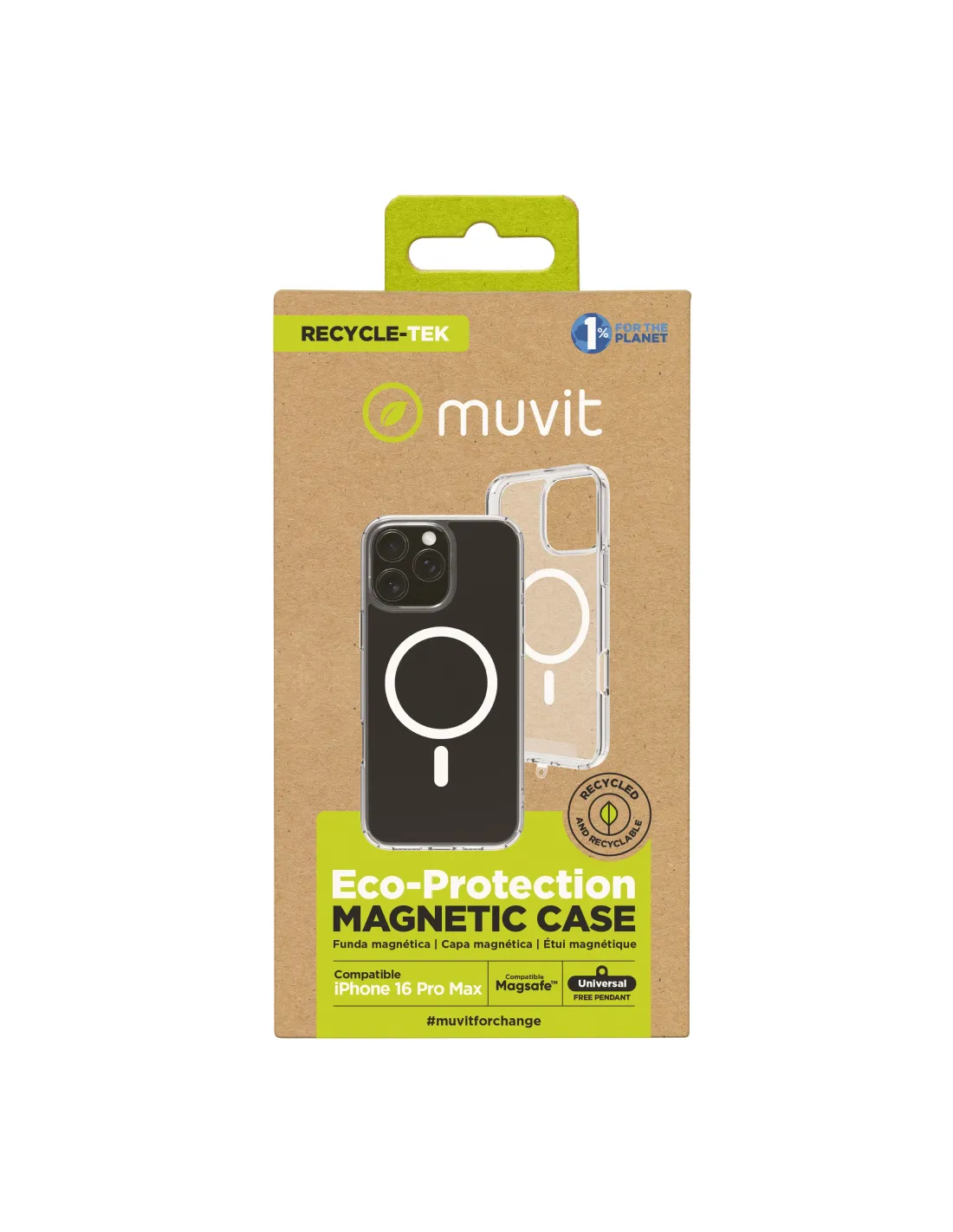 - CARACTERÍSTICAS PRINCIPALES Material: - 100% reciclado mediante un proceso avanzado de recuperación. - 100% reciclable, minimizando residuos y otorgando una nueva vida útil a materiales desechados. - Resistente, conserva las mismas cualidades que los productos hechos con materiales vírgenes. Diseño: - Transparente y suave al tacto. - Incluye imanes para máxima fijación (compatible con MagSafe). - Protege contra arañazos, pequeños golpes y caídas. - Acceso total a puertos, cámara, altavoz y botones. - ECO PACKAGING - Fabricado con cartón certificado FSC, 100% reciclado y reciclable. - Impresión realizada con tintas BIO. - Diseño sin etiquetas adicionales. - Unión con pegamento eco-glue. - COMPROMISO CON LA SOSTENIBILIDAD - Productos diseñados para reducir la huella ambiental. - Fabricados principalmente con plástico reciclado certificado. - Parte de la iniciativa "muvit for change" que fomenta la creación de accesorios eco-sostenibles, como fundas y cargadores solares. **Únete al compromiso medioambiental y protege tu dispositivo de manera sostenible. Cada elección cuenta, y juntos podemos marcar la diferencia.**