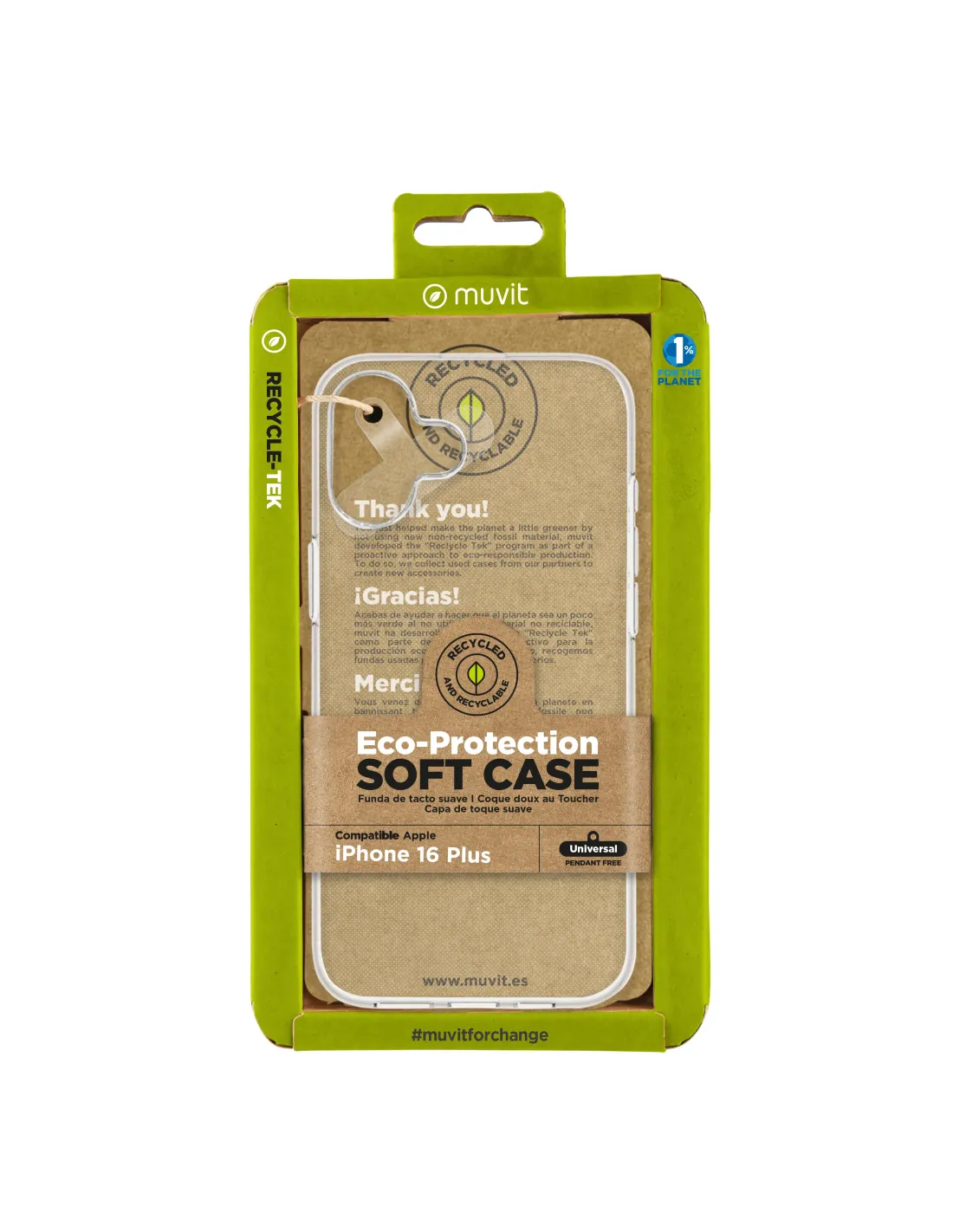 - CARACTERÍSTICAS PRINCIPALES Material: - Fabricado al 100% con materiales reciclados mediante un avanzado proceso de recuperación. - 100% reciclable, reduciendo residuos y ofreciendo una segunda vida útil a materiales desechados. - Material resistente que conserva las mismas cualidades que los productos fabricados con materias primas nuevas. Diseño: - Flexible, duradero y suave al tacto. - Protección contra arañazos, pequeños golpes y caídas. - Acceso total a puertos, cámara, altavoz y botones. - ECO PACKAGING - Fabricado con cartón certificado FSC, 100% reciclado y reciclable. - Unión mediante plegado sin necesidad de pegamentos. - Impresión con tintas BIO ecológicas. - Sin etiquetas adicionales para reducir residuos. - COMPROMISO CON LA SOSTENIBILIDAD - Diseñado para personas que buscan reducir su impacto ambiental. - Fabricado principalmente con plástico reciclado certificado. - Parte de la iniciativa "muvit for change", que promueve accesorios sostenibles como fundas y cargadores solares. **Únete al movimiento y protege tu dispositivo mientras cuidas el planeta. Cada elección sostenible cuenta.**