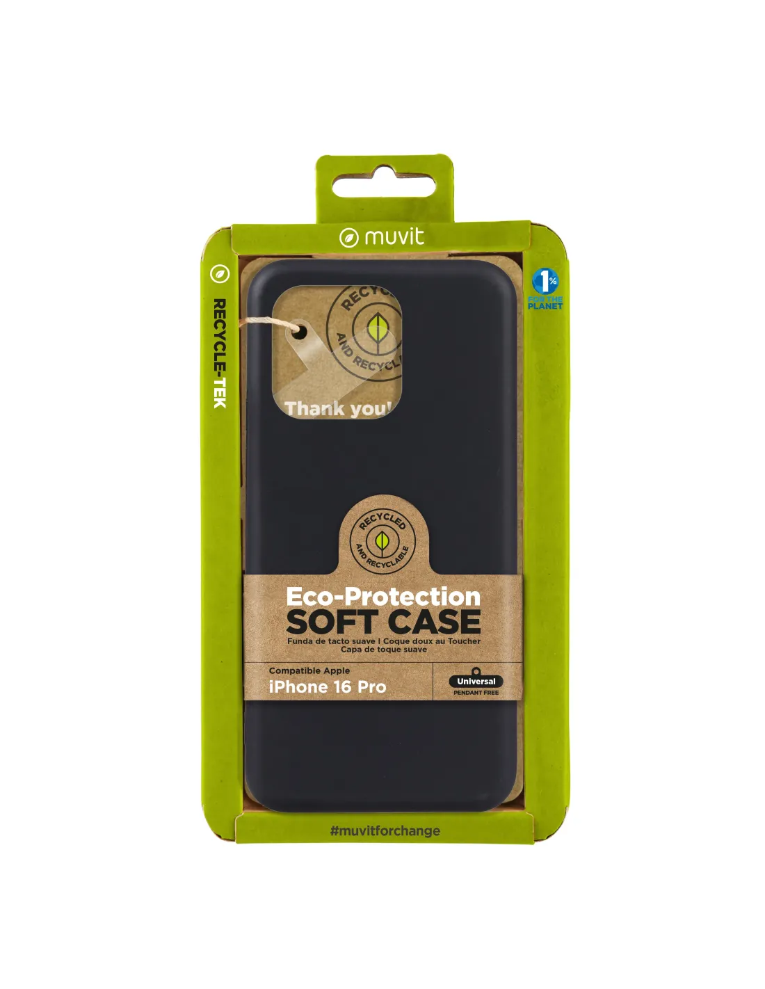 - CARACTERÍSTICAS PRINCIPALES Material: - 100% reciclado mediante un complejo proceso de recuperación. - 100% reciclable, minimizando residuos y dando una nueva vida útil a los materiales desechados. - Material resistente, mantiene las mismas cualidades que los productos fabricados con materias primas nuevas. Diseño: - Flexible y suave al tacto. - Protección frente a arañazos, pequeños golpes y caídas. - Acceso completo a puertos, cámara, altavoz y botones. - ECO PACKAGING - Fabricado con cartón certificado FSC, 100% reciclado y reciclable. - Diseño exclusivo con unión por plegado, sin necesidad de pegamentos. - Impreso con tintas BIO ecológicas. - Sin etiquetas adicionales para reducir residuos. - COMPROMISO CON LA SOSTENIBILIDAD - Parte de la iniciativa "muvit for change", que promueve la creación de accesorios sostenibles fabricados principalmente con plástico reciclado certificado. - Productos diseñados para personas que buscan reducir su impacto ambiental y proteger sus dispositivos de forma responsable. - Gama de accesorios sostenibles que incluye fundas, cargadores solares y más, reflejando un compromiso firme con el cuidado del medio ambiente. **Únete al cambio con muvit for change y protege tu dispositivo de manera consciente mientras cuidas el planeta. Cada elección importa.**