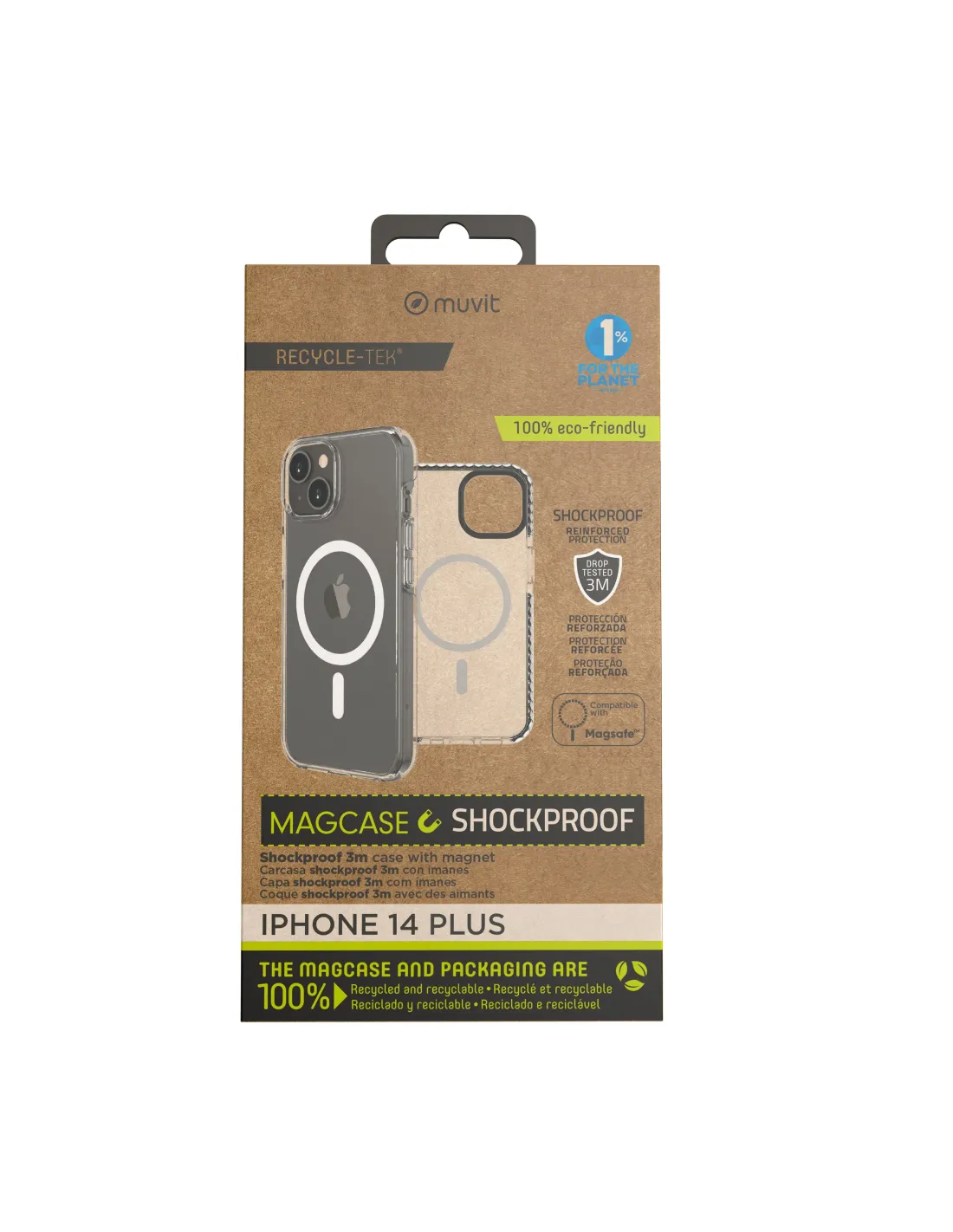 La protección del medio ambiente es, hoy en día, una preocupación en todo momento. Con las fundas recycletek shockproof 3m de muvit for change, proponemos una gama de fundas reciclables,fabricadas con fundas usadas y viejas. Una manera responsable de proteger nuestro smartphone. Porque contribuir en la lucha contra la contaminación y proteger nuestro eco sistema, debe formar partede nuestros gestos cotidianos.Los materiales utilizados en los nuevos móviles son cada vez más delicados y surge la necesidad de protegerlos, para ello hemos diseñado un producto capaz de ofrecer al cliente más intrépido:resistencia y protección para su dispositivo pero sin renunciar al diseño.Fundas Recycletek100% reciclado a partir de un complejo proceso de recuperación.Protegerá tu móvil de caídas y golpes en la vida cotidiana.Protege contra caídas de hasta 3 metros de altura.Flexible y suave al tacto.Protege de arañazos, pequeños golpes y caídas.Acceso a todos los puertos, cámara, altavoz y botones.Material resistenteconserva las mismas cualidades que los productos hechos con materias primasPackagingCartón reciclado y recyclable.Totalmente impreso con tintas BIO.Sin etiquetas ni adhesivos extras.Unión por plegado sin pegamento.