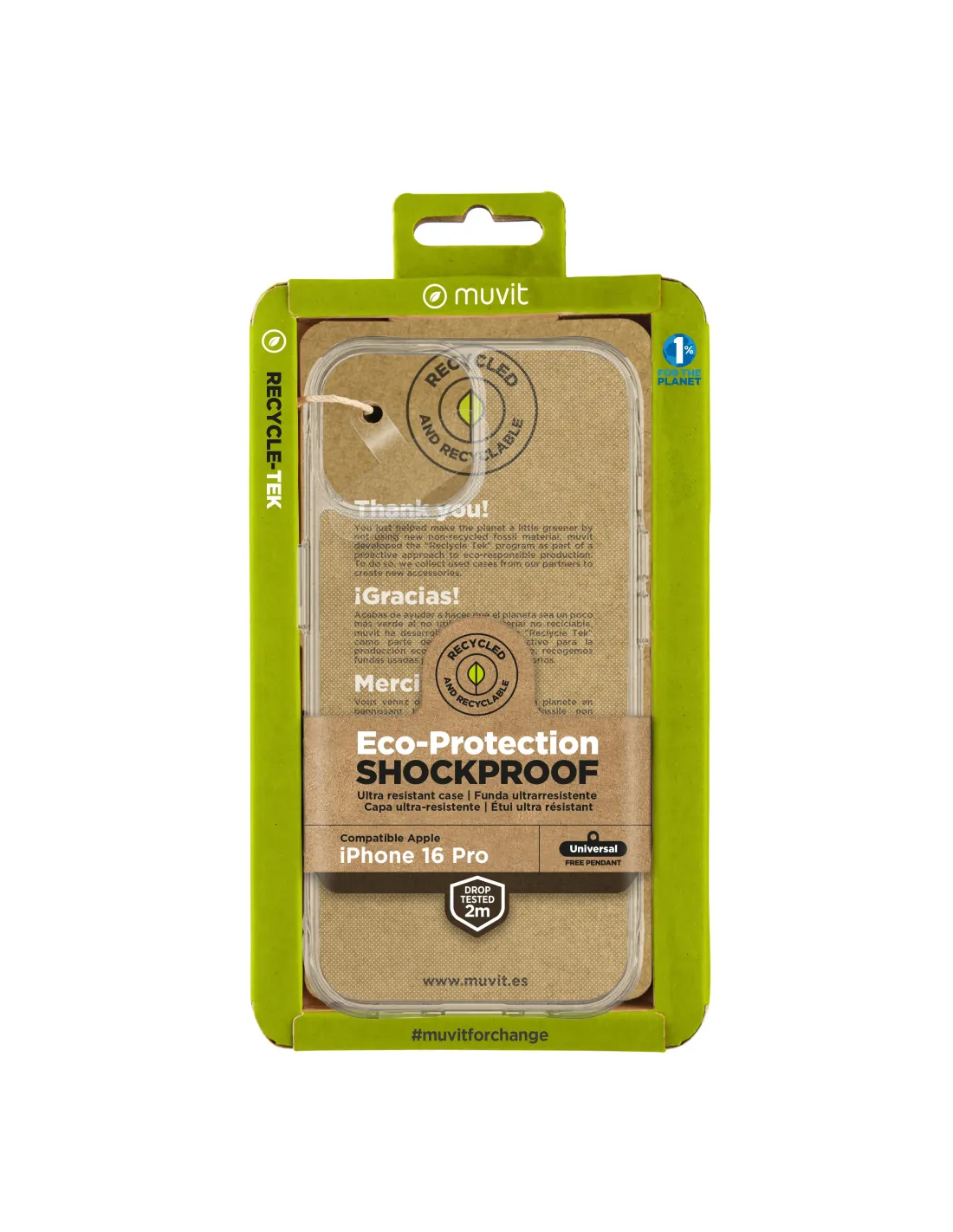 - CARACTERÍSTICAS PRINCIPALES 100% reciclado a partir de un complejo proceso de recuperación. 100% reciclable, genera menos residuos y da una segunda vida útil a los materiales desechados. Material resistente que conserva las mismas cualidades que los productos hechos con materias primas originales. Suave al tacto. Protege de arañazos y caídas de hasta 2 metros. Acceso a todos los puertos, cámara, altavoz y botones. - ECO PACKAGING Cartón certificado FSC, 100% reciclado y 100% reciclable. Diseño exclusivo con unión por plegado sin pegamentos. Impresión completa con tintas BIO. Sin etiquetas adicionales. - BENEFICIOS Convierte tus dispositivos móviles en eco-sostenibles. Fabricados principalmente con plástico reciclado certificado, estos accesorios son una opción consciente para quienes buscan reducir su huella ambiental. Compromiso con la sostenibilidad reflejado en cada producto. Accesorios diseñados para marcar la diferencia mientras cuidas del planeta. Únete al compromiso medioambiental con muvit for change y transforma la forma en que proteges tu dispositivo.