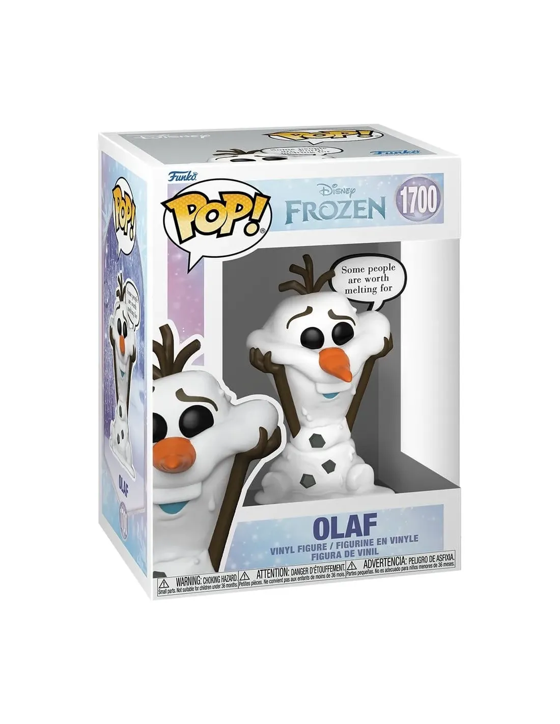 Características del Disney Pop! Olaf (Worth Melting For)El Disney Pop! Olaf (Worth Melting For) es una figura coleccionable ideal para los fans de Disney y de la película Frozen. Este modelo pertenece a la línea POP! Sayings e incluye un simpático bocadillo con la frase "Some people are worth melting for", una de las citas más emotivas del personaje. Una pieza perfecta para añadir un toque entrañable y divertido a cualquier colección.Diseño exclusivo POP! SayingsEsta figura destaca por su diseño temático con burbuja de texto incluida, que refuerza la personalidad optimista y cariñosa de Olaf. Mantiene el inconfundible estilo Funko Pop!, con cabeza sobredimensionada y expresión detallada, fiel al personaje original.Figura Funko Pop! con bocadillo de frase incluidaDiseño basado en Olaf, personaje de FrozenEstilo POP! Sayings exclusivoFormato compacto y materiales de calidadFabricada en vinilo resistente, esta figura está pensada tanto para exposición como para conservación a largo plazo. Su tamaño estándar la hace compatible con el resto de figuras Funko Pop! de Disney, encajando perfectamente en estanterías o vitrinas.Altura aproximada: 9,1 cmMaterial: viniloConstrucción sólida y acabados cuidadosPresentación ideal para coleccionistasEl Disney Pop! Olaf se entrega en su caja original con ventana, identificada con el número 1700. Este formato permite exhibir la figura sin necesidad de abrirla, manteniendo su valor como artículo de colección.Número de caja: 1700Caja expositora con ventana transparenteProducto oficial con licencia DisneyOtras especificacionesItem Number: 90435Categoría: DisneyLicencia: DisneySublicencia: FrozenTipo de producto: Funko Pop!