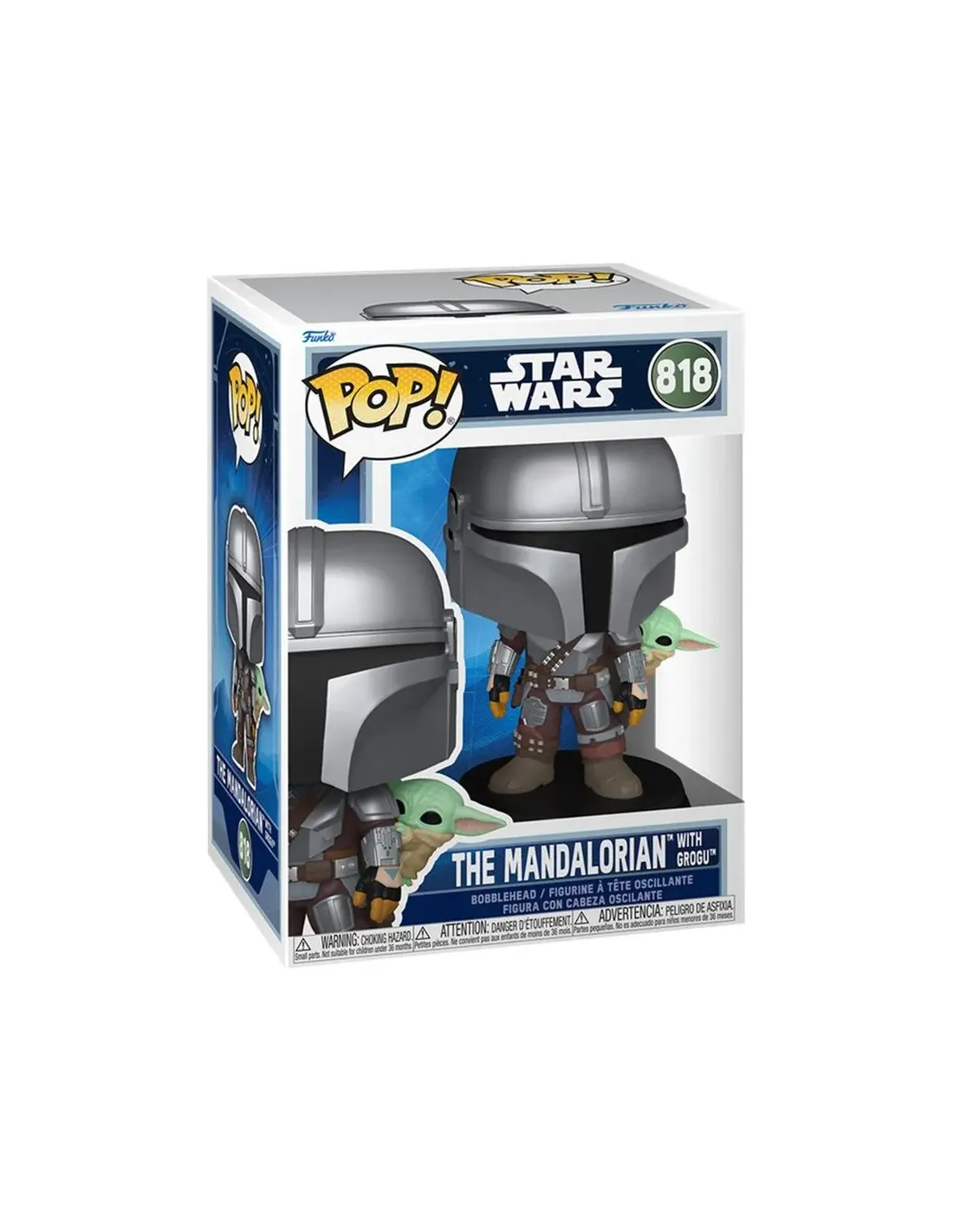 Características del Star Wars Pop! The Mandalorian with Grogu (On Back)La figura Funko Pop! The Mandalorian with Grogu (On Back) es una pieza imprescindible para los fans del universo Star Wars y, en especial, de la serie The Mandalorian. Este icónico dúo llega en formato vinilo con el característico diseño cabezón de la línea Pop!, representando a The Mandalorian con Grogu en su espalda, en una escena reconocible para cualquier seguidor de la saga.Diseño oficial inspirado en The MandalorianEsta figura captura la esencia de los personajes con un acabado detallado y fiel a la licencia oficial. Es una opción ideal tanto para coleccionistas como para quienes buscan un regalo original relacionado con el universo galáctico creado por Star Wars.Licencia oficial: Star WarsSublicencia: The Mandalorian and GroguCategoría: SciFiTipo de producto: Pop! Vinyl BobbleheadFormato compacto y perfecto para exponerCon una altura aproximada de 11,2 cm (4.4 pulgadas), esta figura es perfecta para colocar en estanterías, escritorios o vitrinas de colección. Su tamaño compacto permite integrarla fácilmente junto a otras figuras de la serie, ampliando tu colección de forma ordenada y visualmente atractiva.Altura aproximada: 11,2 cmMaterial: ViniloNúmero de caja: 818Número de artículo: 90443Una pieza imprescindible para coleccionistasEl formato bobblehead característico de Funko aporta un toque dinámico y distintivo a la figura. Gracias a su presentación en caja identificada con número oficial, es una opción ideal tanto para exponer fuera del embalaje como para conservar en su caja original como parte de una colección completa de Star Wars: The Mandalorian.Diseño con Grogu en la espalda (On Back)Formato coleccionable oficial Funko Pop!Ideal para ampliar la línea Star Wars en tu colección