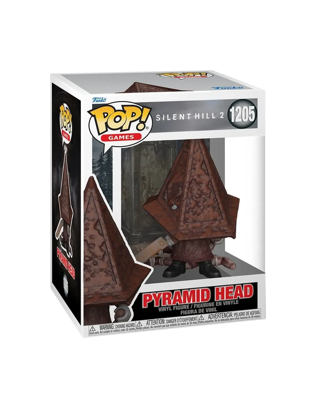 Características del Funko Pop Premium Silent Hill Pyramid HeadEl icónico y aterrador Pyramid Head de Silent Hill 2 llega en versión Funko Pop Premium, ideal para los fans del survival horror y los coleccionistas de figuras gaming. Esta figura de edición especial captura con detalle la presencia imponente del personaje más temido de la saga, perfecta para completar tu estantería dedicada a videojuegos o terror clásico.Diseño fiel al universo Silent HillInspirado en el videojuego Silent Hill 2, este Funko presenta a Pyramid Head con su distintiva cuchilla gigante y casco metálico, representado en una posición estática pero amenazante. El diseño mantiene los tonos oscuros y texturas que remiten al estilo gráfico del juego original.Figura de vinilo con detalles premiumAltura aproximada: 11,4 cm (4,5 pulgadas)Licencia oficial Silent HillUna pieza imprescindible para coleccionistasEste modelo forma parte de la línea POP! Games, y está numerado como el #1204, lo que lo convierte en una pieza clave dentro de la colección dedicada a videojuegos. Ideal para exponer en vitrinas o mantener en su caja original como objeto de coleccionismo.Caja ilustrada con ventana frontalPerteneciente a la categoría VideojuegosNúmero de referencia Funko: 90710Otras especificacionesTipo de producto: Pop! VinylCategoría: VideojuegosLicencia: Silent Hill