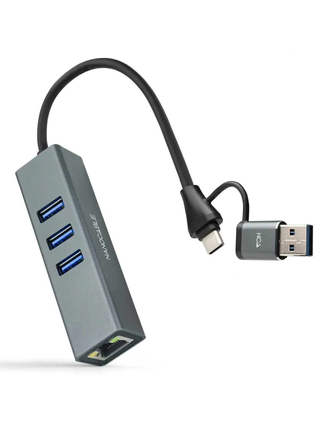 Marca Nanocable Modelo 10.03.0412 Características - Conectores de entrada: USB-C macho y adaptador USB-A macho - Puertos de salida: 1 x RJ45 Ethernet 3 x USB Tipo A 3.0 hembra - Velocidad Ethernet: hasta 1.000 Mbps - Funcionamiento: Plug and Play - Compatibilidad: Windows y macOS - Longitud del cable: 15 cm - Material: aleacion de aluminio y ABS - Normativa: RoHS Dimensiones - 1,7 x 2,4 x 9,6 cm Fecha de revisión 27-01-2026 por IS