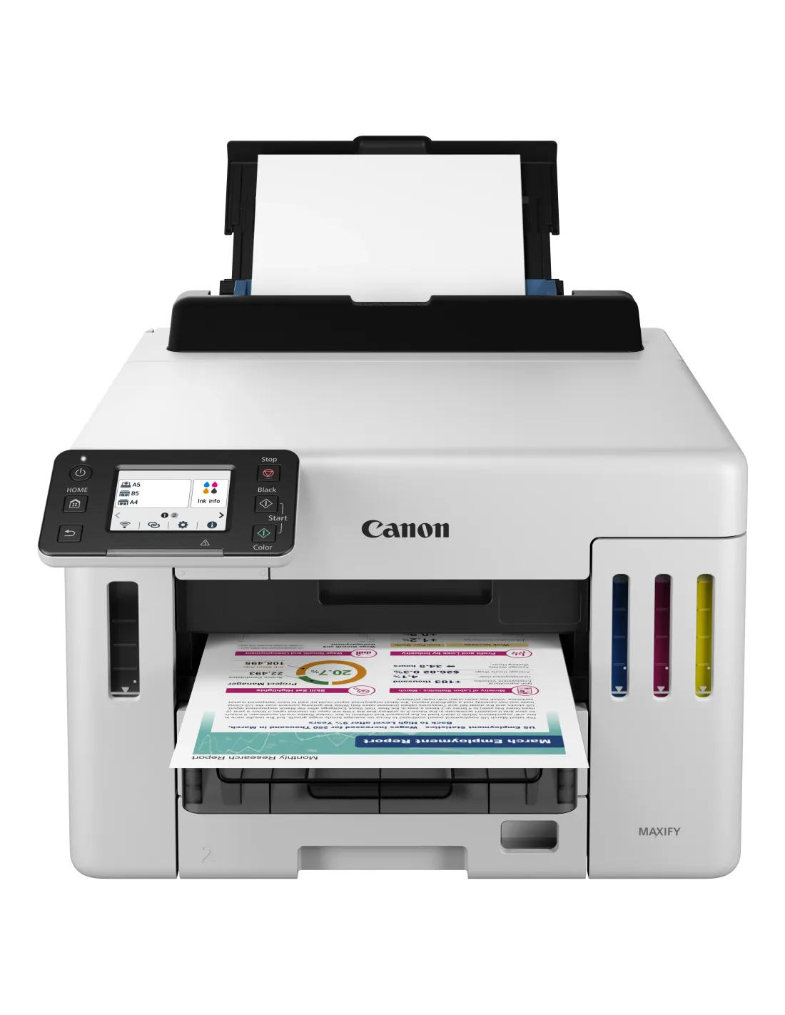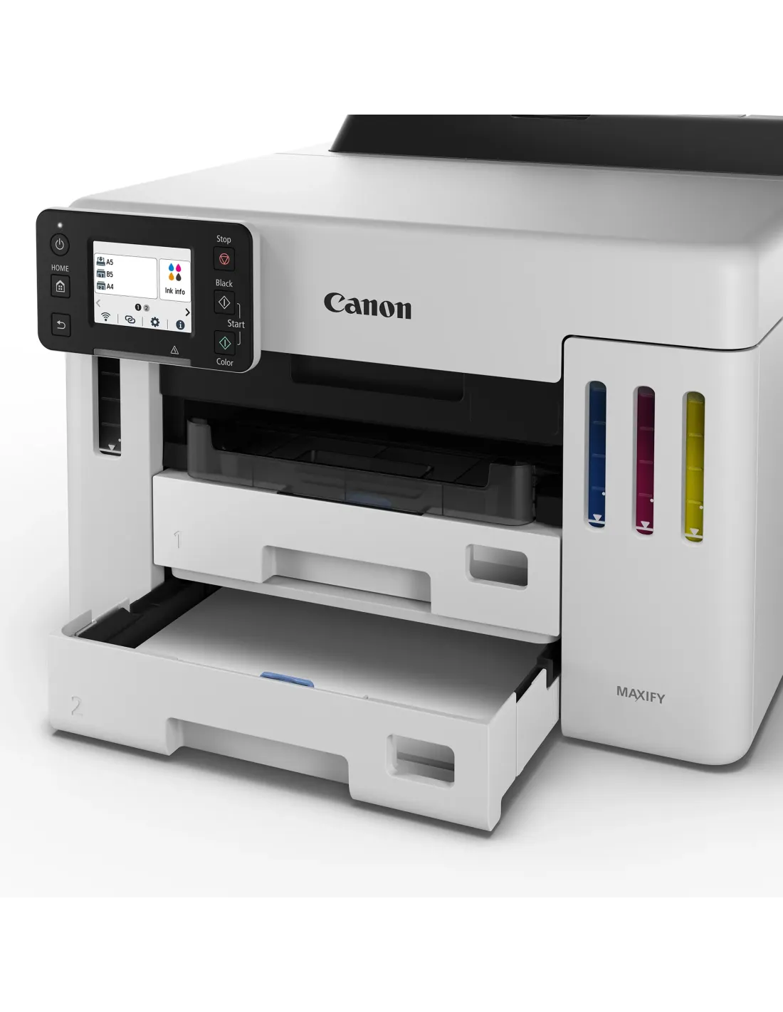 Características más destacadasImpresora de inyección de tinta para oficinaA4, solo imprimirWi-Fi, pantalla táctil LCD de 6,9 cm, capacidad para 600 hojas de papel normalEspecificaciones generalesFuncionesWi-Fi, Ethernet, impresión y nubeEspecificaciones de la impresoraResolución de impresiónHasta 600 x 1200 ppp1Márgenes de impresión (mín.)Superior: 3 mm, inferior: 5 mm, izquierda y derecha: 3,4 mmTecnología de impresión1 cabezal de impresiónImpresora con depósito de tinta rellenableVelocidad de impresión en blanco y negroaprox. 24 ipm2Velocidad de impresión en coloraprox. 15,5 ipm3Tiempo de salida de la primera impresiónBlanco y negro: 7 s (lista/una cara)4Color: 8 s (lista/una cara)5Impresión a dos carasImpresión automática a doble cara (A4, Carta: papel normal)Consumibles y rendimientosBotellas de tinta estándarGI-56 BKGI-56 CGI-56 MGI-56 YCartucho de mantenimientoMC-G01(sustituible por el usuario)Rendimiento de la botella (papel normal)Impresión de documentos en color A46Negro: 6000 páginas (9000 páginas en el modo económico)7Color: 14 000 páginas (21 000 páginas en el modo económico)8* Rendimiento adicional estimadoCompatibilidad de papelTipos de papelPapel fino (de 52 g/m a 63 g/m),Papel normal (de 64 g/m a 105 g/m),Papel fino (de 106 g/m a 250 g/m),Red Label Superior 80 g/m (WOP111),Canon Oce Office Colour Paper 80 g/m (SAT213)Papel fotográfico Pro Luster (LU-101),Papel fotográfico Brillo II (PP-201)Papel fotográfico Mate (MP-101),Papel fotográfico Brillo de uso diario (GP-501)Papel de alta resolución (HR-101N),Sobre,Tarjeta de felicitación (fabricada por Avery y RedRiverPaper)Cartulina (fabricada por Neenah Paper e INKPRESS)Papel fotográfico Plus Semi Brillante (SG-201),Papel fotográfico adhesivo (RP-101)Papel fotográfico magnético (MG-101)Papel de transferencia térmica para tejidos claros (LF-101),Papel mate de doble cara (MP-101D)Entrada máxima de papelBandeja posterior: máx. 100 hojas (papel normal)Casete 1: máx. 250 hojas (papel normal)Casete 2: máx. 250 hojas (papel normal)Tamaños del papelBandeja posterior: A4, A5, A6, B5, B6, B6H, LTR, LGL, B-Oficio, M-Oficio, Tamaño folio, Ejecutivo, 10 x 15 cm (4" x 6"), 13 x 18 cm (5" x 7"), 18 x 25 cm (7" x 10"), 20 x 25 cm (8" x 10"), Cuadrado 127 x 127 mm (5" x 5"), Sobres(DL, COM10, C5 y Monarch),Tamaño personalizado (anchura: de 64 mm a 216 mm, longitud: de 127 mm a 1200 mm)Casete 1: A4, LTR, A5, B5, Ejecutivo[Tamaño personalizado] anchura de 148 mm a 216 mm, longitud de 210 mm a 297 mmCasete 2: A4, LTR, LGL[Tamaño personalizado] anchura de 210,0 mm a 216,0 mm, longitud de 279,4 mm a 355,6 mmGramaje del papelBandeja posterior: papel fino: 52 g/m - 63 g/m, papel normal: 64 g/m - 105 g/m o papel original de Canon compatiblePapel Canon: peso máx. aproximado de 265 g/m(papel fotográfico brillo II [PP-201])Casete 1: papel fino: 52 g/m - 63 g/m, papel normal: 64 g/m - 105 g/mCasete 2: papel fino: 52 g/m - 63 g/m, papel normal: 64 g/m - 105 g/mInterfazTipo y tamaño de pantallaLCD de 2,7"/6,7 cm (pantalla táctil, color)Idiomas de visualizaciónPosibilidad de seleccionar entre 33 idiomas: japonés, inglés (mm y pulg.), francés, alemán, italiano, español, portugués, holandés, danés, noruego, sueco, finlandés, griego, polaco, checo, ruso, húngaro, esloveno, turco, chinosimplificado, chino tradicional, coreano, indonesio, eslovaco, estonio, letón, lituano, ucraniano, rumano, búlgaro, croata, vietnamita, tailandésConectividadInterfaz estándarUSB de alta velocidad (puerto B)Ethernet: 10/100 Mbps (conmutación automática)Wi-Fi: IEEE802.11 n/g/b/a/ac9Seguridad Wi-Fi: WPA-PSK (TKIP/AES), WPA2-PSK (TKIP/AES), WPA3-SE (AES)/WPA-EAP (AES)*, WPA2-EAP (AES)*, WPA3-EAP (AES)*, contraseña de administraciónBanda de frecuencia de LAN inalámbrica: 2,4 GHz, 5 GHz *: IEEE802.1X (EAP-TLS/EAP-TTLS/PEAP)El USB y la red se pueden utilizar al mismo tiempo.Las conexiones Wi-Fi y LAN con cable no se pueden utilizar al mismo tiempo.Aplicaciones móvilesAplicación Canon PRINT Inkjet/SELPHY10Aplicación Creative Park11Aplicación Easy-PhotoPrint Editor12Funciones de impresoraSoftware Easy-PhotoPrint Editor13PIXMA Cloud Link14Canon Inkjet Smart Connect (Windows 10, versión 1803 o superior)Easy-Layout Editor (Windows 7 SP1, Windows 8.1, Windows 10, Windows 11)Complemento Canon Print Service (Android)15Apple AirPrint16Wireless Direct17Mopria (Android)18Servicios de impresión compatiblesAmazon Alexa19SoftwareSistemas operativos compatiblesWindows 11, Windows 10, Windows 8.1, Windows 7 SP1Solo se garantiza el funcionamiento en un PC con Windows 7 o posterior instalado.Solo driver e IJ Printer Assistant Tool: Windows Server 2008 R2 SP1, Windows Server 2012 R2, Windows Server 2016, Windows Server 2019 y Windows Server 2022.Mac: macOS 10.15.7, macOS 11, macOS 12, macOS 13Sistemas móviles compatiblesChrome OSiOS, iPadOS, Android20Requisitos mínimos del sistemaEntorno de pantalla: XGA 1024 x 768 o superiorWindows: 1,5 GB o másNota: Para la instalación del software incluido. La cantidad de espacio en el disco duro necesaria.Software incluidoDriver de la impresoraIJ Printer Assistant ToolEasy-PhotoPrint Editor (descarga)21Asistente de conexión Wi-Fi (descarga)Quick Utility Toolbox (descarga)Características físicasPesoaprox. 10,4 kgDimensiones (An. x Pr. x Al.)Con las bandejas retraídas:Aprox. 399 x 410 x 298 mmCon las bandejas extendidas:Aprox. 399 x 639 x 392 mmNiveles de ruidoaprox. 48,7 dB(A)22Entorno operativo recomendado5-35 C10-90 % HR (sin condensación)Fuente de alimentación100-240 V de CA a 50/60 HzCiclo de trabajoHasta 45 000 páginasConsumo eléctricoApagada: aprox. 0,1 WEn espera (conexión USB a PC): aprox. 0,8 WEn espera (todos los puertos conectados): aprox. 1,3 WTiempo para entrar en modo en espera: 5 minutos 2 segundosImprimiendo: aprox. 22W23*No se puede modificar el tiempo para entrar en modo en espera (Lot26)Consumo eléctrico típico0,15 kWh24