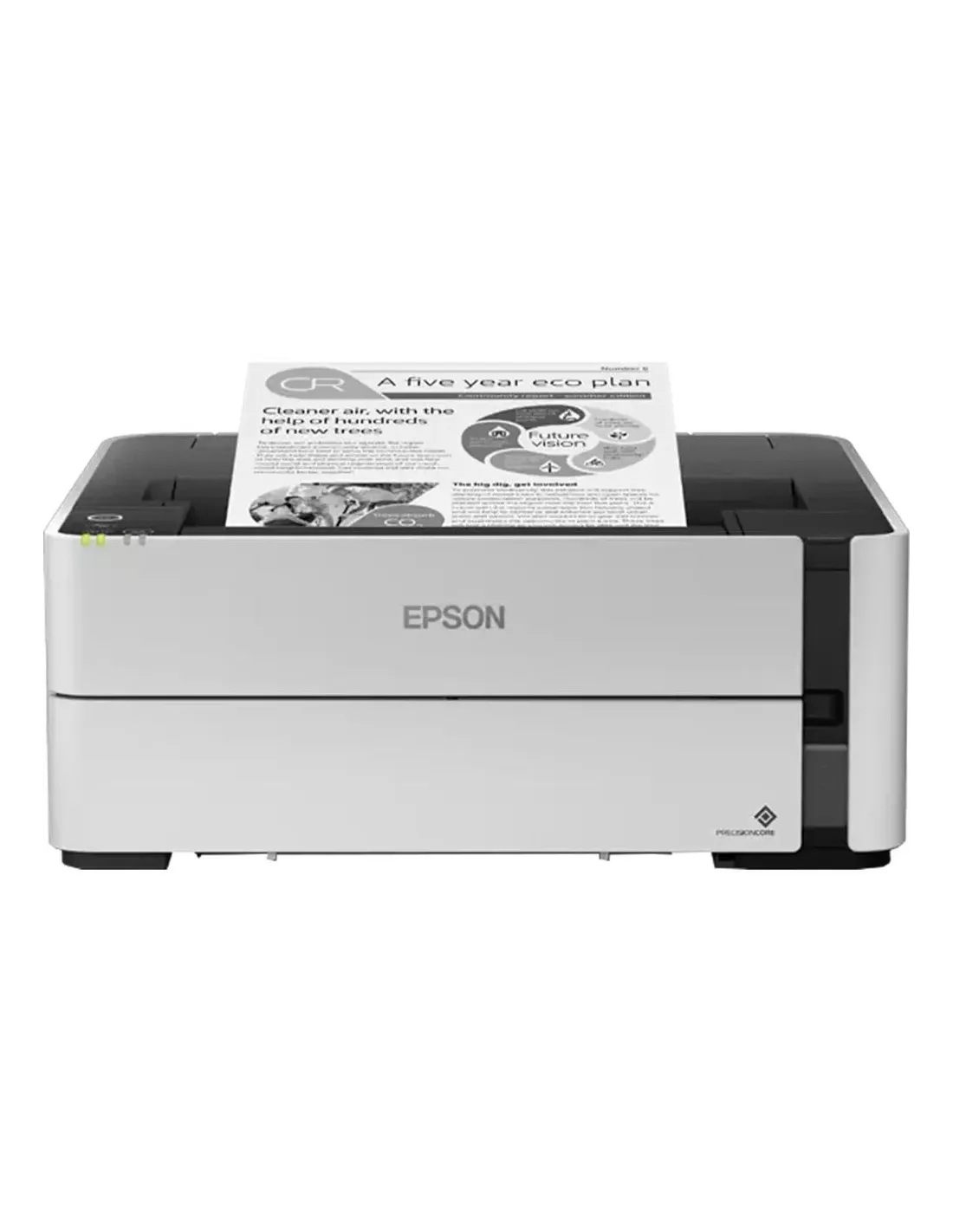 Características de la Epson EcoTank ET-M1180La Epson EcoTank ET-M1180 es una impresora monofunción ideal para entornos de trabajo pequeños o domésticos que buscan una solución de impresión eficiente, ecológica y con un coste por página muy reducido. Diseñada para oficinas que requieren alta productividad y bajo mantenimiento, esta impresora monocromo destaca por su sistema de tinta recargable, conectividad flexible y rendimiento profesional con un consumo energético eficiente.Impresión rápida y de alta precisiónGracias a la tecnología PrecisionCore?, la ET-M1180 ofrece una impresión monocromo rápida y nítida, perfecta para documentos empresariales. Su tiempo de salida de la primera página es de solo 6 segundos y puede alcanzar velocidades de hasta 39 páginas por minuto en modo borrador.Resolución de impresión: 1.200 x 2.400 pppVelocidad ISO: 20 ppm en monocromoImpresión a doble cara automática (dúplex): hasta 9 ppmSistema EcoTank de alto rendimientoEsta impresora incorpora un depósito de tinta recargable que reemplaza los cartuchos tradicionales, reduciendo drásticamente el coste por página y la generación de residuos. La botella de tinta negra incluida permite imprimir hasta 11.000 páginas, lo que la convierte en una opción económica y sostenible.Rendimiento de tinta negra: hasta 11.000 páginasTinta pigmentada resistente al agua y al subrayadoIdeal para impresiones de texto profesionalConectividad flexible para entornos modernosLa ET-M1180 está equipada con múltiples opciones de conectividad, lo que permite integrarla fácilmente en redes domésticas o empresariales. Además, es compatible con servicios de impresión en la nube como Epson Connect y Google Cloud Print, facilitando la impresión remota desde dispositivos móviles.Wi-Fi, Wi-Fi Direct, Ethernet y USB 2.0Compatible con iPrint, Email Print y Remote Print DriverSeguridad de red: WPA2, WEP, WPA PSK, entre otrosDiseño compacto y bandeja de alta capacidadA pesar de su estructura compacta, la impresora ofrece una bandeja de entrada de 250 hojas y una capacidad de salida de hasta 100 hojas, adaptándose a cargas de trabajo diarias sin interrupciones. Está recomendada para volúmenes de impresión de entre 200 y 1.500 páginas mensuales.Dimensiones: 375 x 347 x 151 mmPeso: 4,3 kgCiclo de trabajo máximo: 5.000 páginas/mesBajo consumo energético y funcionamiento silenciosoLa ET-M1180 está pensada para un funcionamiento eficiente, con un consumo energético mínimo y un nivel de ruido reducido, ideal para oficinas compartidas o entornos silenciosos.Consumo en impresión: 14 WModo espera: 3,4 W / Modo ahorro: 0,7 WNivel sonoro: hasta 56 dB (A)Compatibilidad y soporte amplioCompatible con una amplia variedad de sistemas operativos, la EcoTank ET-M1180 garantiza una integración sin problemas tanto en entornos Windows como macOS, incluyendo versiones empresariales y servidores.Compatibilidad: Windows XP hasta Windows 11 y macOS 10.6.8 hasta macOS 10.13.xEmulaciones: PCL5e, PCL6, PCL5cOtras especificacionesFormatos de papel soportados: A4, A5, A6, B5, B6, sobres DL, C6, Nº 10, carta, legalPeso del papel: 64 a 256 g/m²Número de bandejas: 1Recorrido posterior para soportes especiales: SíVoltaje: 220 - 240 V