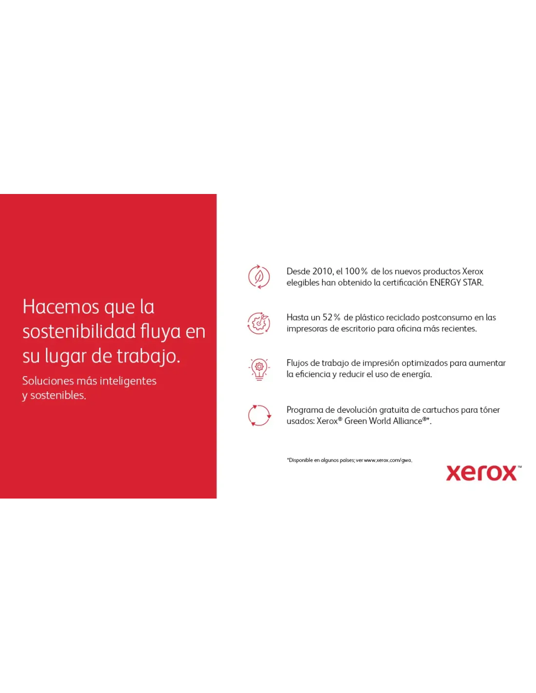 Características de la Xerox C410V_DN - Impresora láser a colorLa Xerox C410V_DN es una impresora láser profesional diseñada para entornos de trabajo exigentes que requieren alta velocidad, calidad de impresión superior y conectividad avanzada. Ideal para oficinas medianas o departamentos que gestionan grandes volúmenes de documentos, este modelo combina rendimiento, seguridad y eficiencia en un formato compacto y fiable.Impresión rápida y de alta calidadGracias a su tecnología láser y su motor de 1 GHz, la Xerox C410V_DN ofrece resultados profesionales a gran velocidad. Imprime hasta 42 ppm en blanco y negro y color (formato Letter) y permite trabajos a doble cara automáticamente, optimizando tiempo y consumo de papel.Resolución real: 1200 x 1200 pppVelocidad de impresión: hasta 42 ppm (Letter) / 40 ppm (A4)Primera página lista en solo 6,1 seg. (B/N) y 6,4 seg. (color)Amplia conectividad y funciones inteligentesEquipada con puertos USB, LAN Gigabit y pantalla táctil de 4,3", esta impresora facilita la gestión de tareas desde distintos dispositivos y ofrece acceso a herramientas como Xerox CentreWare Web y opciones seguras como Secure Print. Además, es compatible con AirPrint para impresión desde dispositivos Apple.Pantalla táctil de 4,3" para control intuitivoConexiones: USB Tipo B, host USB 2.0 y LAN GigabitCompatibilidad con Windows 10/11, Windows Server y macOS 11.x a 13.xManejo versátil de papel y gran capacidadCon soporte para diferentes gramajes y tipos de papel, la C410V_DN está preparada para adaptarse a diversas necesidades de oficina. Incorpora una bandeja de entrada de 250 hojas y una manual para formatos especiales. Su capacidad máxima llega hasta las 2001 hojas.Bandeja de entrada: 250 hojas + bandeja manual de 1 hojaSalida de papel: hasta 125 hojasSoporta gramajes de 60 a 200 g/m² y formatos A4, A5, Legal, sobres, etiquetas, etc.Seguridad avanzada y eficiencia energéticaEste modelo cumple con estándares como FIPS 140-2 y ENERGY STAR, integrando funciones de protección como encriptación TLS 1.3, Secure Print o firmware firmado digitalmente. Además, su consumo en reposo es muy bajo, contribuyendo al ahorro energético.Protocolos de seguridad: TLS 1.3, IPsec, filtrado de puertos, etc.Consumo en funcionamiento: 417 WModo reposo: solo 2 WIncluye consumibles de arranqueLa impresora viene equipada con cartuchos de tóner iniciales para que puedas comenzar a imprimir desde el primer momento.Tóner negro: hasta 2400 páginasTóner cian, magenta y amarillo: hasta 2000 páginas cada unoDiseño robusto y preparado para grandes volúmenesA pesar de su tamaño compacto, esta impresora soporta un volumen mensual recomendado de hasta 10.000 páginas y un ciclo máximo de 125.000 páginas, siendo una opción fiable para uso intensivo.Memoria RAM integrada: 1 GBMemoria flash: 8 GBPeso: 20,6 kg / Dimensiones: 44,5 x 31,8 x 42,3 cmOtras especificacionesTecnología de mejora de imagen: 4800 Color QualityProtocolos de red: HTTP, HTTPS, IPP, SNMPEmisión de ruido operativa: 52 dBATemperatura de funcionamiento: 10 °C a 32 °CSoftware: Xerox CentreWare Web, Embedded Web ServerIncluye opciones de impresión como filigranas, modo borrador, folleto, N-Up, entre otrosPrograma de reciclaje: Xerox Green World Alliance