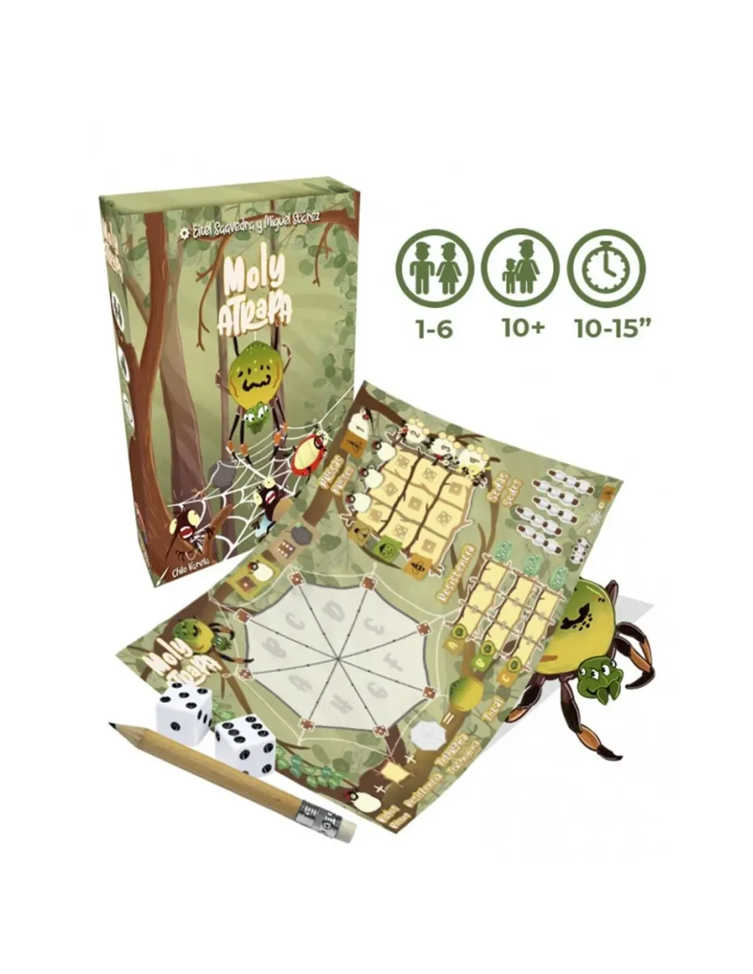 Moly atrapa es un juego roll & write diseñado por Eitel Saavedra y MiguelSuarez, inspirado en la fauna de Chile, y en la asombrosa y bella especie dela Molinaranea magellanica,la araña Moly.