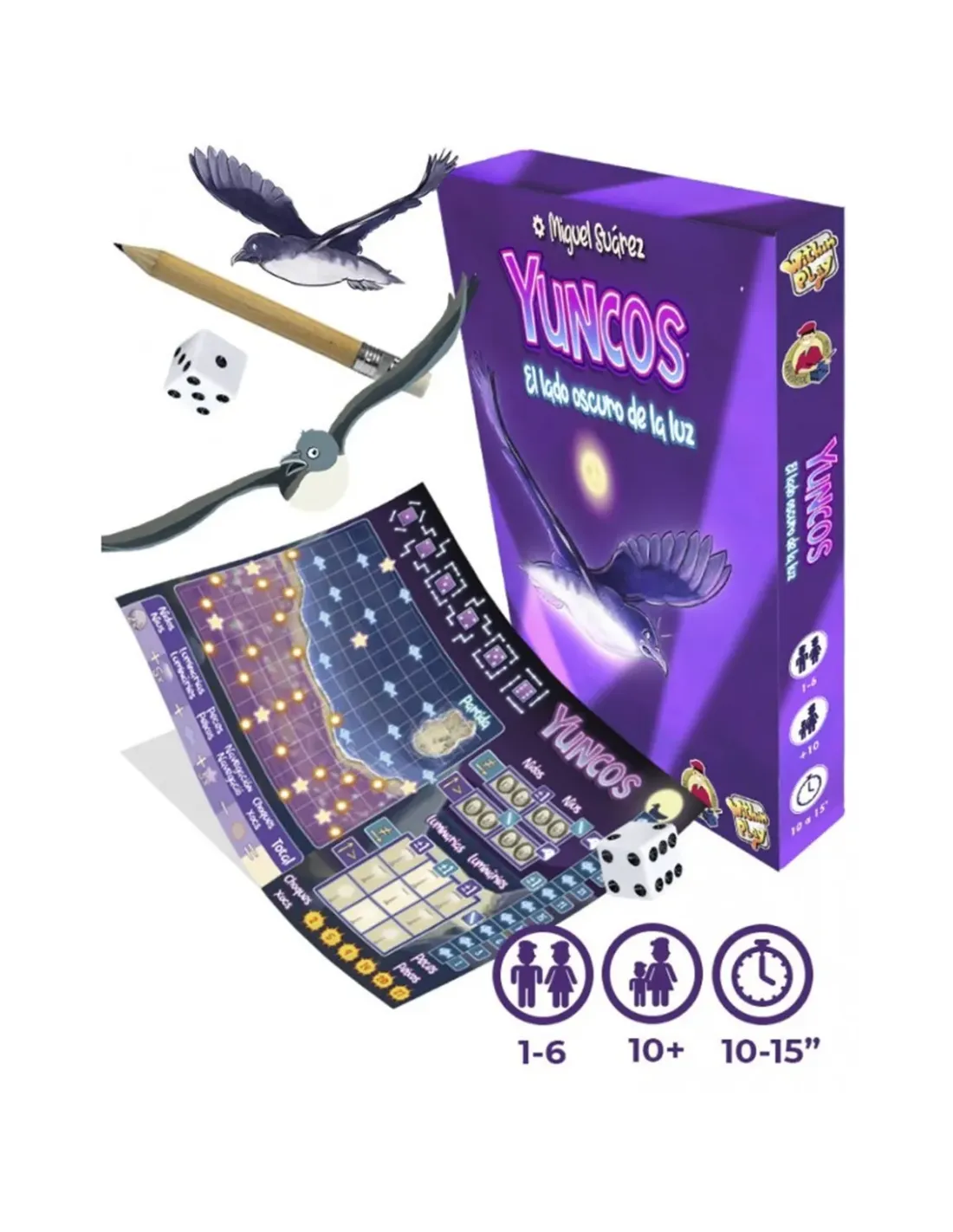 Yuncos: El lado oscuro de la luz es un juego roll & write diseñado por MiguelSuarez, inspirado en la fauna de Chile, y en la preservación y protección desus especies. Recomendado para jugar entre 1 y 6 jugadores ,a partir de 10años de edad, con partidas de entre 10 y 15 minutos de duración.