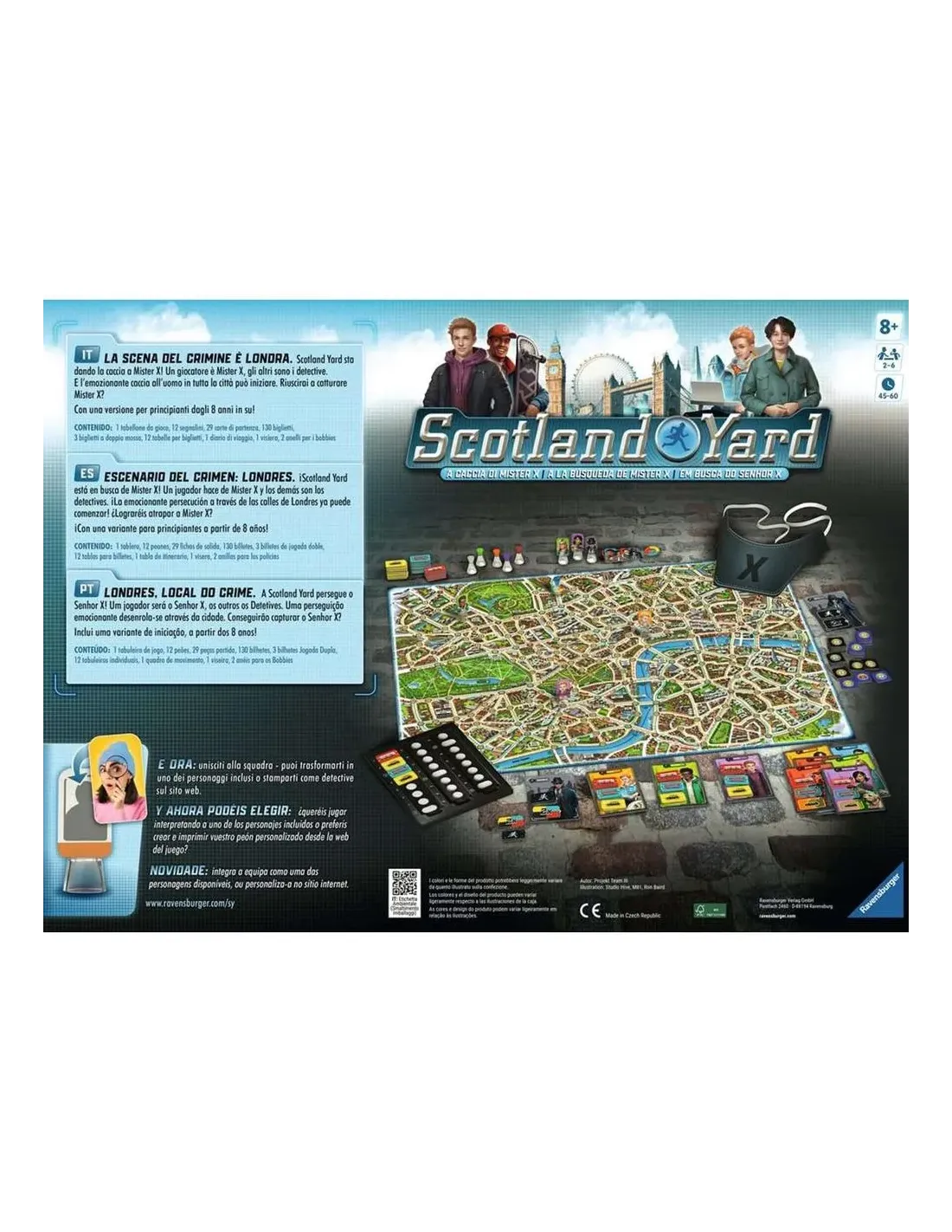 Scotland Yard "A la búsqueda de Mister X" es un juego de mesa que vuelve en una edición renovada. La reedición de un clásico atemporal. La intuición y la cooperación ayudarán a los detectives a impedirlas jugadas de Mister X. ¿A quién te gustaría encarnar? ¿Al implacable villano o a los intrépidos guardianes de la ley?En Scotland Yard, uno de los jugadores asume el papel de Mister X. Su trabajo consiste en desplazarse de un punto a otro del mapa de Londres tomando taxis, autobuses o metros. Los detectives -esdecir, el resto de jugadores que actúan de forma concertada- se mueven de forma similar en un esfuerzo por situarse en el mismo espacio que Mister X. Pero mientras que el modo de transporte delcriminal se conoce casi siempre, su ubicación exacta sólo se conoce de forma intermitente a lo largo del juego.Un brillante juego de deducción con dos facciones enfrentadas y elementos cooperativos.CONTENIDO: 1 tablero, 12 peones, 29 fichas de salida, 130 billetes, 3 billetes de jugada doble, 12 tablas para billetes, 1 tabla de itinerario, 1 visera, 2 anillas para los policíasEdad recomendada: 8+Número jugadores: 2-6Duración partida: 45-60 minutos aprox.