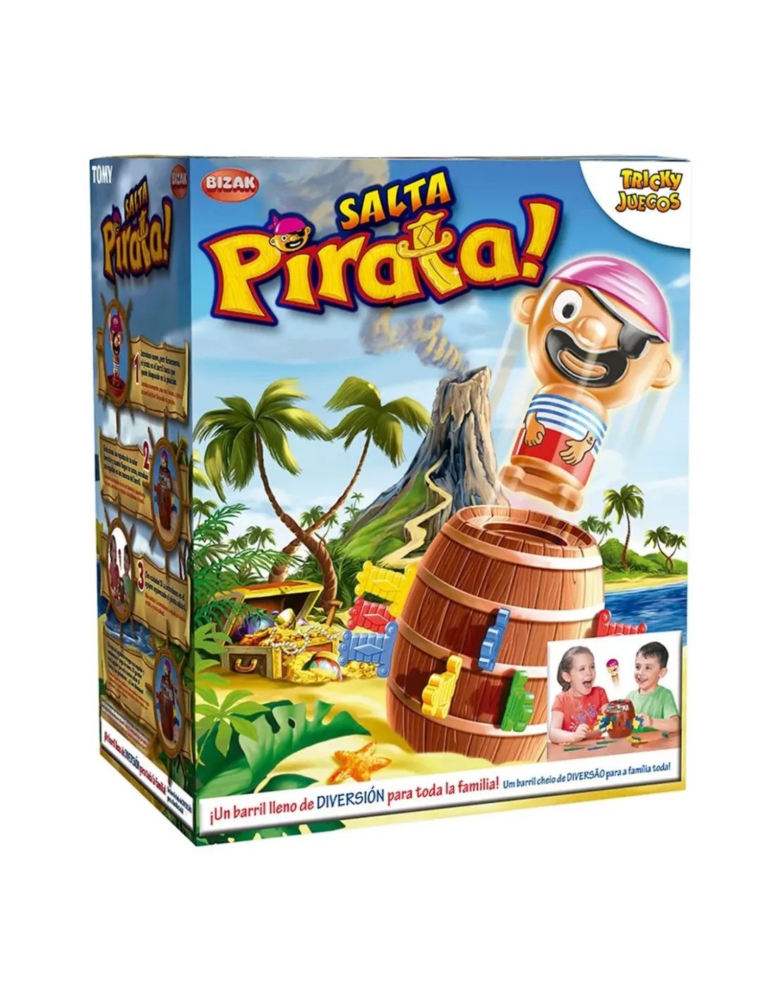 Introduce las espadas de tu color en cualquiera de los agujeros del barril del pirata, pero piénsalo bien, pues si el agujero no es el correcto, el pirata salta y tú habrás perdido la partida. A partir de 3 años. Hasta 4 jugadores.