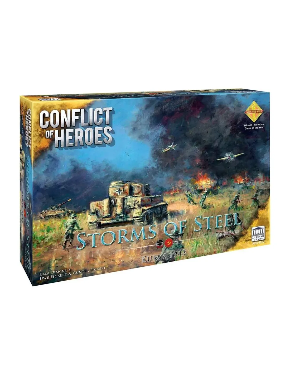 Conflict of Heroes: Storms of Steel 3rd Prepárate para sumergirte en las feroces batallas de tanques de la Segunda Guerra Mundial con Conflict of Heroes: Storms of Steel 3rdEdition de Academy Games. Esta apasionante expansión cubre una de las mayores batallas de tanques de la historia, en la que las divisiones Panzer alemanas se enfrentaron a las fuerzas soviéticasen una lucha desesperada por la supremacía en el Frente Oriental.Características principales:Guerra de tanques histórica: Revive la intensidad de la Batalla de Kursk, donde las fuerzas alemanas y soviéticas se enfrentaron en brutales combates blindados en un intento por ganar ventaja en elpaisaje devastado por la guerra del Frente Oriental.Jugabilidad actualizada: Con la 3.ª edición, Storms of Steel ofrece reglas y mecánicas refinadas que capturan los matices tácticos de la guerra de tanques, proporcionando a los jugadores unaexperiencia de juego auténtica e inmersiva.Profundidad estratégica: Navega por los desafíos del campo de batalla mientras comandas tus fuerzas y despliegas tácticas para superar a tus oponentes en maniobras y armas, poniendo a pruebatus habilidades en el crisol del combate.Superposiciones de mapas: Mejora tus tiroteos con superposiciones de mapas de alta calidad que añaden nuevas dimensiones a tu juego, lo que permite una inmersión más profunda y flexibilidadestratégica.Rejugabilidad infinita: Con su jugabilidad dinámica y escenarios variados, Storms of Steel garantiza que no haya dos batallas iguales, ofreciendo interminables horas de emoción y desafío estratégicopara jugadores de todos los niveles.Contenido:¡Con las últimas reglas de Conflict of Heroes de la 3ª edición!¡Se actualizaron los mapas y las ilustraciones superpuestas para que sean muy detallados y más hermosos que los originales!¡Todos los nuevos contadores además de las nuevas versiones de los contadores anteriores!¡Nuevo formato de caja, con inserciones de bandeja actualizadas diseñadas por Game Trayz!Número de jugadores 2-4Edad 14+Duración 60-240