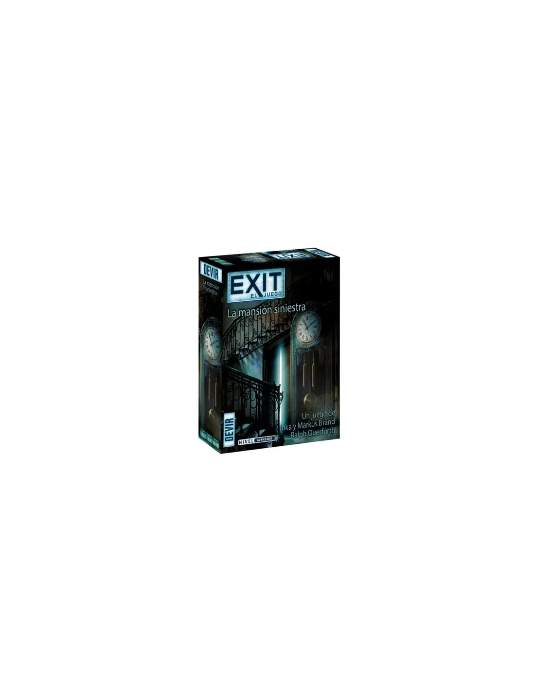 Los juegos de mesa de Devir, Exit, son un nuevo concepto de juegos demesa basados en las conocidas scape rooms o "sala de escape". Cadatítulo distinto presenta una aventura nueva para quienes se aventuran consus familiares y/o amigos en todo un desafio.La mecánica de los juegos de mesa Exit consiste en lo siguiente: Habrá unmanual de reglas dentro de la caja, así como un decodificador y un mazode cartas. Podremos coger una serie de cartas que nos presentaran losdiferentes puzzles, a modo de pruebas y desafios, a resolver para lograrnuestro objetivo. Si creemos tener la respuesta correcta, la introduciremosen el decodificador mencionado anteriormente. Este nos dirigirá hacia unacarta del mazo, si esta muestra una X, significa que es incorrecta, pero sies correcta avanzaremos hacia el siguiente enigma. Hay varias cartas quenos proporcionaran pistas y nos serviran a lo largo de la partida enmomentos puntuales por si nos atascamos en algun púnto del juego.En EXIT 11 LA MANSIÓN SINIESTRA, justo a vuestra casa nunca osplantearíais encontrar una mansión deshabitada. Una nota en vuestrobuzón os invita a ir, y corroidos por la curiosidad os aventurais dentro. Lapuerta se cierra de golpe y un escalofrío os recorre todo el cuerpo, nosabeis si acabais de cometer el peor error de vuestra vida pero unaaventura comienza llena de enigmas y desafios.Ficha Técnica:- Número de jugadores de 1 a 4.- Duración aproximada: 90 minutos- Edad mínima recomendada: 10 años- Idioma: Español- Tipo: Juego de Tablero