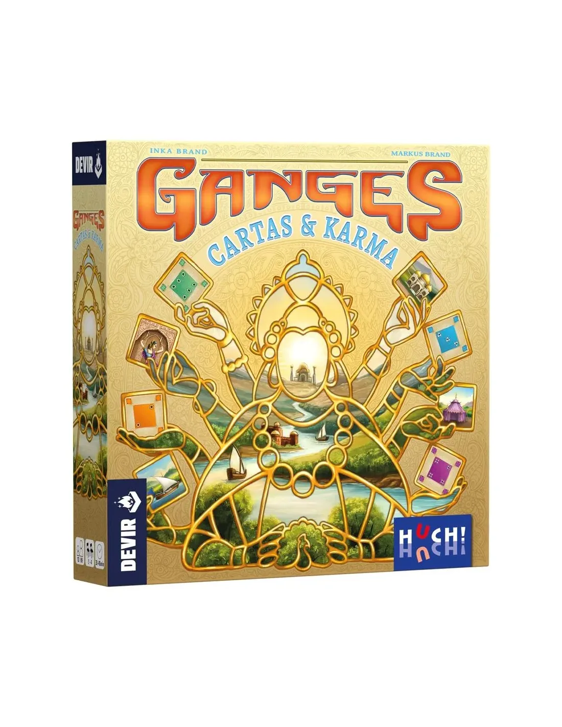 Retrocedamos en el tiempo, hasta la India del incipiente Imperio mogol. Sois rajás, construís espléndidos edificios a orillas del Ganges y vendéis valiosas mercancías para obtener gloria y riqueza.Podéis examinar las cartas de dado que tenéis en la mano, pero ahora, con buen tino y perspicacia, tenéis que decidir cómo las vais a usar. Aprovechad la carga de vuestros barcos y la influencia de loshabitantes del palacio para ganar karma, cartas adicionales y otras recompensas. Además, si alguna vez conseguís alguno de los posibles tríos, contaréis con el favor de un administrador polivalenteque os ayudará a mejorar vuestras provincias. Al final, veremos qué estrategia ha dado los mejores resultados. Diseñado por Inka y Marcus Brand (creadores de la célebre saga de juegos Exit), estaedición es completamente independiente del Ganges original de colocación de dados. Permite partidas para grupos de 2 a 4 jugadores, a partir de 12 años, de unos 45 minutos de duración. El objetivode Ganges Cartas y Karma consiste en sumar gloria y riqueza para tu provincia. Cuando un jugador obtiene 3 fichas de gloria o 6 rupias, voltea una carta de su marcador de puntuación y recibe unabonificación. El primer jugador que voltee las 6 cartas de su marcador gana la partida. El motor principal de esta edición de Ganges son las cartas que, por un lado, muestran una acción y por el otro uncolor y un valor de dado específico. A lo largo de la partida, estos valores servirán para pagar el coste de adquirir nuevas cartas. En cada turno, los jugadores podrán comprar cartas de distintos tipos(edificios, barcos, mercancías) para obtener recursos clave: monedas, karma y gloria. Esta nueva edición del clásico Ganges no puede faltar en las estanterías de los amantes de los juegos tipo euro.Los autores han logrado contener en un formato portátil y económico toda la esencia de su predecesor. Preparado para cosechar fama y riquezas en la India de los rajás?Número de jugadores Min:2 Máx:Tiempo de juego 40 minutosEdad recomendada 12Idioma Castellano y Portugués
