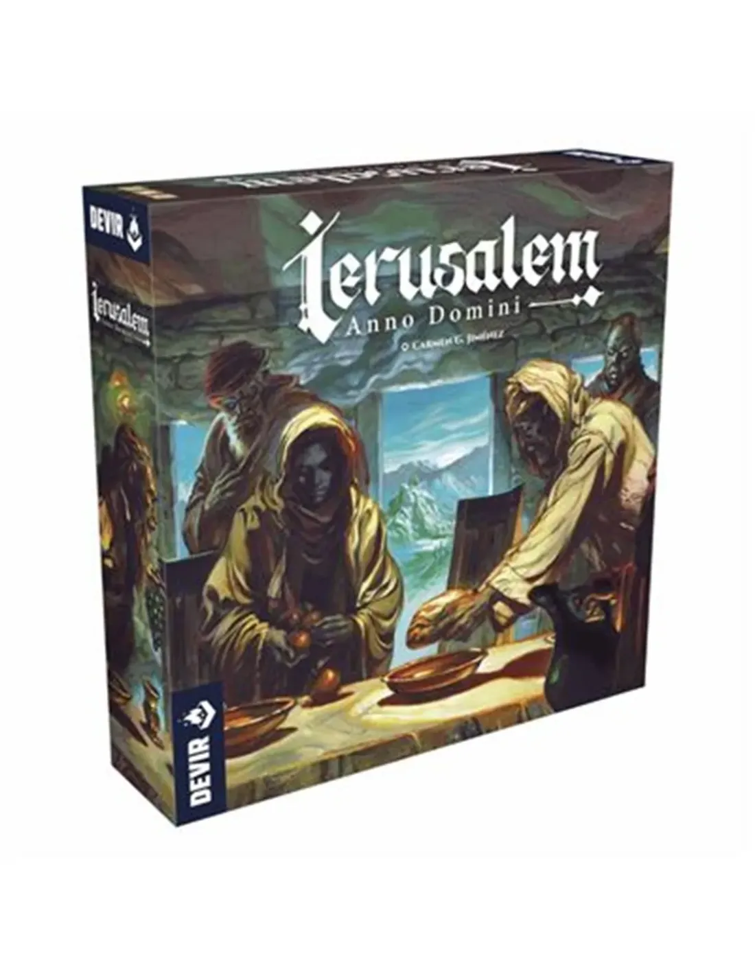 Jerusalén, primavera del año 33. Una multitud se congrega en las puertas de la ciudad para dar la bienvenida a Jesús de Nazaret, que se dispone a celebrar laPascua con sus apóstoles y seguidores. Con un mensaje revolucionario, ha cosechado partidarios por doquier, pero también miradas de recelo entre lasautoridades religiosas. Pronto se celebrará la Última Cena y se sellará el destino de uno de los personajes más influyentes de la historia de la humanidad.En Ierusalem Anno Domini, cada jugador representa a una de las comunidades de seguidores de Jesús de Nazaret que, venidos hasta Jerusalén desde pueblos yaldeas cercanos, quieren acercarse hasta el lugar de la Última Cena y colocarse lo más cerca posible de los asientos de Jesús y sus apóstoles.Diseñado por Carmen G. Jiménez e ilustrado por L.A. Draws, Ierusalem Anno Domini se puede jugar en solitario o hasta con 4 participantes. El objetivo del juegoes tener la mayor presencia de seguidores de tu comunidad junto a la mesa de la Última Cena. Cuanto más cerca estén de los apóstoles y del propio Jesús, mayornúmero de puntos de victoria proporcionarán al final de la partida. También nos darán puntos las losetas de parábola que hayamos acumulado o las fichas deofrenda.En el tablero se muestran distintas ubicaciones: el mercado, el desierto, el monte, el lago y el templo. Tras mandar a nuestros seguidores a una de estaslocalizaciones, obtendremos piedras, panes y peces, así como también denarios o cartas que nos permitirán hacer más de una acción. Entre estas acciones, losjugadores podrán elegir entre escuchar una parábola, ir a la cena, cambiar de sitio o hacer un favor, entre otras. Todo ello irá sucediendo mientras lapaciencia del Sanedrín se agota. Cuando esto ocurre, simbolizado por una ficha que se va desplazando por un marcador, se desencadena el final de partida.Sin embargo, el elemento principal del juego son las cartas. Cada carta tiene un símbolo correspondiente a una de las cinco ubicaciones clave del juego. Alirlas jugando, se formarán combinaciones que nos permitirán llevar a los apóstoles a la mesa de la Última Cena. La colocación óptima de nuestros seguidoresalrededor de Jesús y los apóstoles también se realizará mediante la gestión de las cartas, así como de diversos recursos a nuestro alcance. Pero no todos losapóstoles nos aportarán puntos positivos... Aquellos seguidores que se sitúen cerca de Judas reportarán puntos negativos.Tras una temática muy inmersiva, Ierusalem Anno Domini no defraudará a los amantes de los buenos retos. Los jugadores dispondrán de un amplio abanico deposibilidades a su alcance y de múltiples vías de conseguir puntos de victoria. Preparar las mejores estrategias para sacar el máximo partido de vuestrosseguidores será una de las claves para alcanzar la victoria. Los jugones más devotos no hace falta que busquéis más: ¡Aquí tenéis vuestro juego!