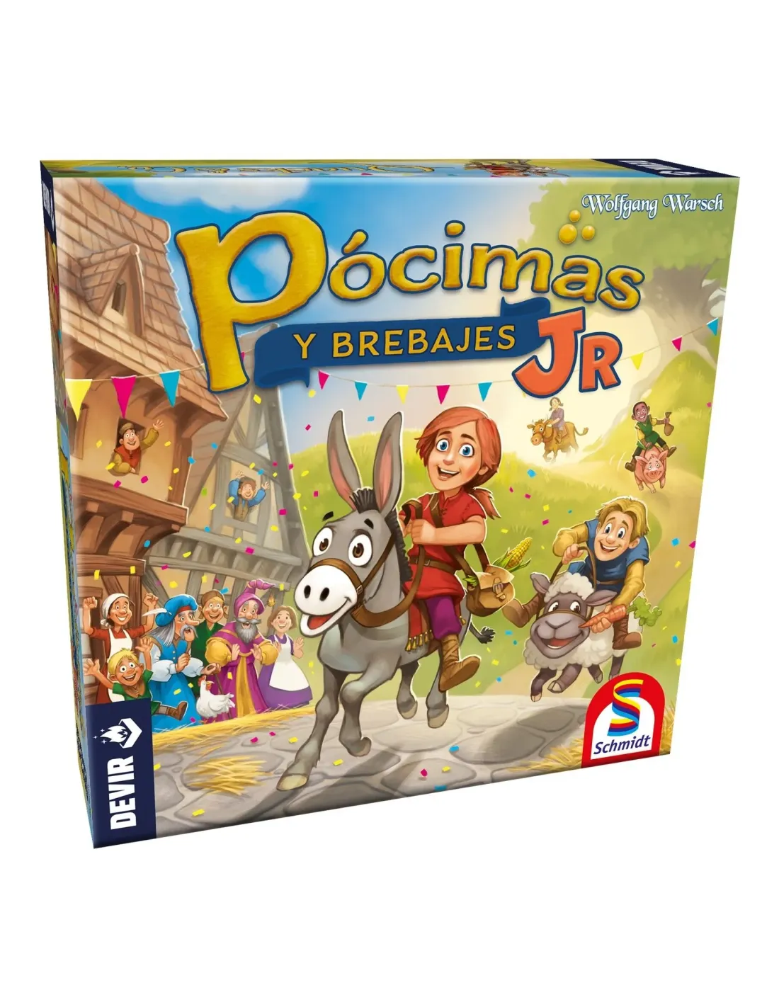 ¡Monta a lomos de tu animal favorito y lánzate a la carrera! En esta edición del clásico Pócimas y brebajes pensada para los más pequeños de casa, los jugadores competirán por ser los primeros enalcanzar la meta en la carrera más popular de la preciosa ciudad de Quedlinburg. Para ello, deberán alimentar a sus monturas con la combinación de comida que les permita avanzar más rápido.Diseñado por Wolfgang Warsch e ilustrado por Michael Menzel, permite partidas de 2 a 4 jugadores, a partir de 6 años, de unos 25 minutos de duración. Si ya conocéis Pócimas y brebajes, seguro queencontraréis muchas similitudes con esta versión totalmente independiente del juego, ya que ambos títulos tienen en común que los jugadores van llenando su propia bolsa de fichas para luego obteneralgunas de ellas aleatoriamente. Antes de empezar, hay que tomar una decisión importante: Qué animal nos llevará hasta la meta? Tras elegir entre un burro, una oveja, un cerdo o una vaca, deberéispreparar vuestra bolsa de provisiones, con un poco de comida y ramas de adormidera negra. A lo largo de la partida, los jugadores sacarán una ficha de su bolsa por turnos. Si sacan una ficha decomida, avanzarán tantas casillas por el tablero como el número que indique la ficha. A continuación se desencadenará una acción, indicada con el mismo color que el de la ficha. Entre estas accionespodréis obtener rubíes (que os permitirán comprar comida más nutritiva) o más comida. Por otro lado, si sacáis de vuestra bolsa la ficha de adormidera negra... ¡Vuestro animal se quedará dormidocomo un tronco y perderéis el turno! Pócimas y brebajes Jr también incorpora un modo de juego más avanzado para adaptarse a cualquier situación o grupo de juego. Si queréis probar este modo, usadlas cartas por el lado de la mariposa. Ideal para familias que quieran ampliar su colección con un juego para los más pequeños, este título también será un reto para los mayores. Quién ganará lacarrera y obtendrá el preciado caldero dorado como premio?NÚMERO DE JUGADORES De 2 a 4 jugadoresTIEMPO DE JUEGO 25 minutosEDAD RECOMENDADA 6IDIOMA Castellano, italiano y portugués