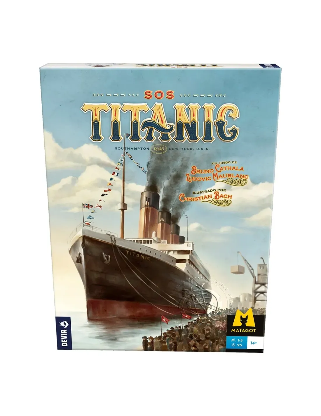 Acabamos de chocar con un iceberg en mitad del océano Atlántico Norte. El fuerte impacto ha sido repentino y de graves consecuencias. El agua está inundando los compartimentos del transatlántico yel barco se inclina a estribor de manera preocupante. El pánico se ha apoderado de los pasajeros Haría falta un milagro para que pudiéramos salvarlos a todos. Como miembro de la tripulación abordo del barco, debes mostrar entereza y solvencia para tomar las mejores decisiones para salvar vidas. El tiempo es escaso, cada decisión es crucial y es nuestro deber salvar a tantos comopodamos. SOS Titanic es un juego familiar diseñado por los célebres Bruno Cathala y Ludovic Maublanc (ambos ya habían colaborado para crear otros títulos como Mr. Jack, Dice Town o Cyclades) eilustrado por Christian Bach. Se puede disfrutar en solitario o en partidas cooperativas de hasta 5 jugadores, a partir de 14 años. El título nos propone recrear el fatídico viaje inaugural del Titanic, ocurridohace 111 años, en abril de 1912, y tomar el papel de miembros de la tripulación. Solos o en equipo, los jugadores ganarán puntos salvando tantos pasajeros como sea posible. Cada jugador tomará unacarta distinta de tripulante, cada una de ellas con habilidades y características distintas. La zona de juego está formada por un cuaderno, que a través de sus páginas representa el hundimientoprogresivo del Titanic, y una baraja de 60 cartas con los pasajeros que hay que salvar y que se agolpan en filas a través de los camarotes, esperando llegar a uno de los botes. En su turno, los jugadoresdeberán trasladar los pasajeros a los botes. A medida que se van revelando pasajeros en las colas, se pueden evacuar siguiendo un estricto orden numérico. Sin embargo, los pasajeros de primera ysegunda clase no se pueden mezclar entre ellos, así que no será fácil gestionar el rescate. Además, el caos puede desatarse en cualquier momento si se inundan los camarotes: puede que lospasajeros corran en desbandada y se mezclen con las colas de los camarotes contiguos. Con distintos modos de dificultad disponibles, SOS Titanic se presenta como todo un reto con aires al clásicojuego de cartas Solitario, con el que comparte la mecánica principal de ir apilando cartas siguiendo un orden determinado. No obstante, las habilidades de los miembros de la tripulación, las cartas deacción y las dinámicas de las cartas de pasajero añaden complejidad al sistema de juego, que destaca por su inmersión temática con un cuidado apartado gráfico. Tanto si disfrutas jugando en solitariocomo si eres amante de los cooperativos, SOS Titanic puede ser una buena opción para sumarse a tu ludoteca. A cuántos pasajeros conseguirás salvar del desastre?NÚMERO DE JUGADORES De 1 a 5 jugadoresTIEMPO DE JUEGO 30 minutos.EDAD RECOMENDADA 14IDIOMA Castellano