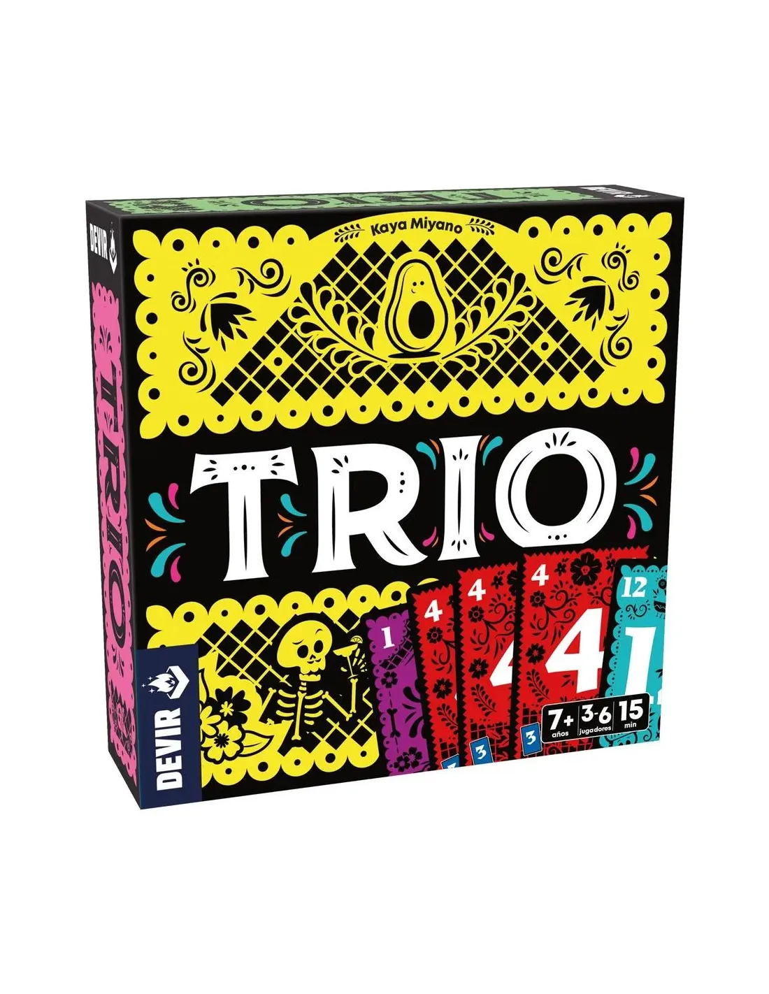 Un, dos, tres ¡Trío! Busca y recuerda las cartas que tienen el resto de los jugadores y las que hay en el centro de la mesa para formar conjuntos de tres cartas iguales antes que lo haga el resto.Disfruta de un rato agradable con el modo sencillo, desafía a tus rivales con el modo picante o compite formando equipos. Sea como sea, sea con quien sea, Trio promete horas de diversión con tansolo unas pocas cartas. Diseñado por Kaya Miyano e ilustrado por Laura Michaud, Trio permite partidas para grupos de 3 a 6 personas, a partir de 7 años, de unos 15 minutos de duración. El objetivo delos jugadores consiste en formar tríos de cartas antes que lo hagan sus oponentes. Suena fácil, verdad? Dentro de la caja de Trio hay 36 cartas, divididas en tres barajas con números del 1 al 12. Cadajugador recibe un número determinado de cartas (entre 9 y 5, según el total de participantes) y otras tantas se dejan en el centro de la mesa. En su turno, cada jugador revela cartas de una en una, yasean de la mano de otros jugadores o bien del centro de la mesa. Si revela 2 cartas con números distintos, termina el turno. De lo contrario, continua hasta revelar 3 números idénticos. Si quiere la cartade un jugador, solo puede pedir la más alta o la más baja. Cuando alguien logra revelar tres cartas iguales, se las queda e intenta conseguir 3 tríos para ganar la partida (o lograr el trío especial desietes, que otorga la victoria automática). Sencillo e ingenioso, Trio es además un título muy versátil, ya que cuenta con dos modos de juego: sencillo y picante. La variante picante añade un punto decomplejidad, pues hay que conseguir dos tríos conectados. Todas las cartas tienen en su parte inferior el dibujo de otra carta con un número, con el que están conectadas. El objetivo de todos en estemodo de juego es conseguir tríos con estas cartas. Trio también se puede disfrutar en equipos de 2 jugadores, si se cuenta con un grupo de 4 o 6 personas. En este caso no se ponen cartas en elcentro de la mesa y se reparten todas las cartas. ¡Hay un montón de formas de jugar a Trio! Trio es un juego rápido y divertido que pondrá a prueba vuestra memoria y agudeza visual. En cada turno serevelan cartas nuevas y hay que estar atento a las posibles combinaciones. Ideal para grupos, Trio es un compañero perfecto para amenizar cualquier viaje o sobremesa. De formato compacto y precioajustado, no puede faltar en ninguna ludoteca.Número de jugadores Min:3 Máx:6Tiempo de juego 15 minutosEdad recomendada 7Idioma Castellano