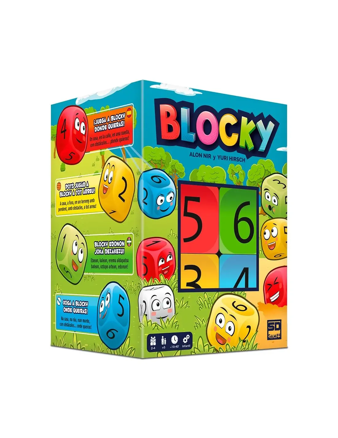 Blocky, el juego para toda la familia, ¡lo puedes jugar en cualquier sitio!En casa, al aire libre, en un terreno inclinado, con obstáculos... ¡en todas partes!El primero en conseguir 40 puntos, gana la partida.Componentes-9 dados gigantes-1 pizarra-1 rotulador borrable-1 bolsa de transporte-1 reglamento
