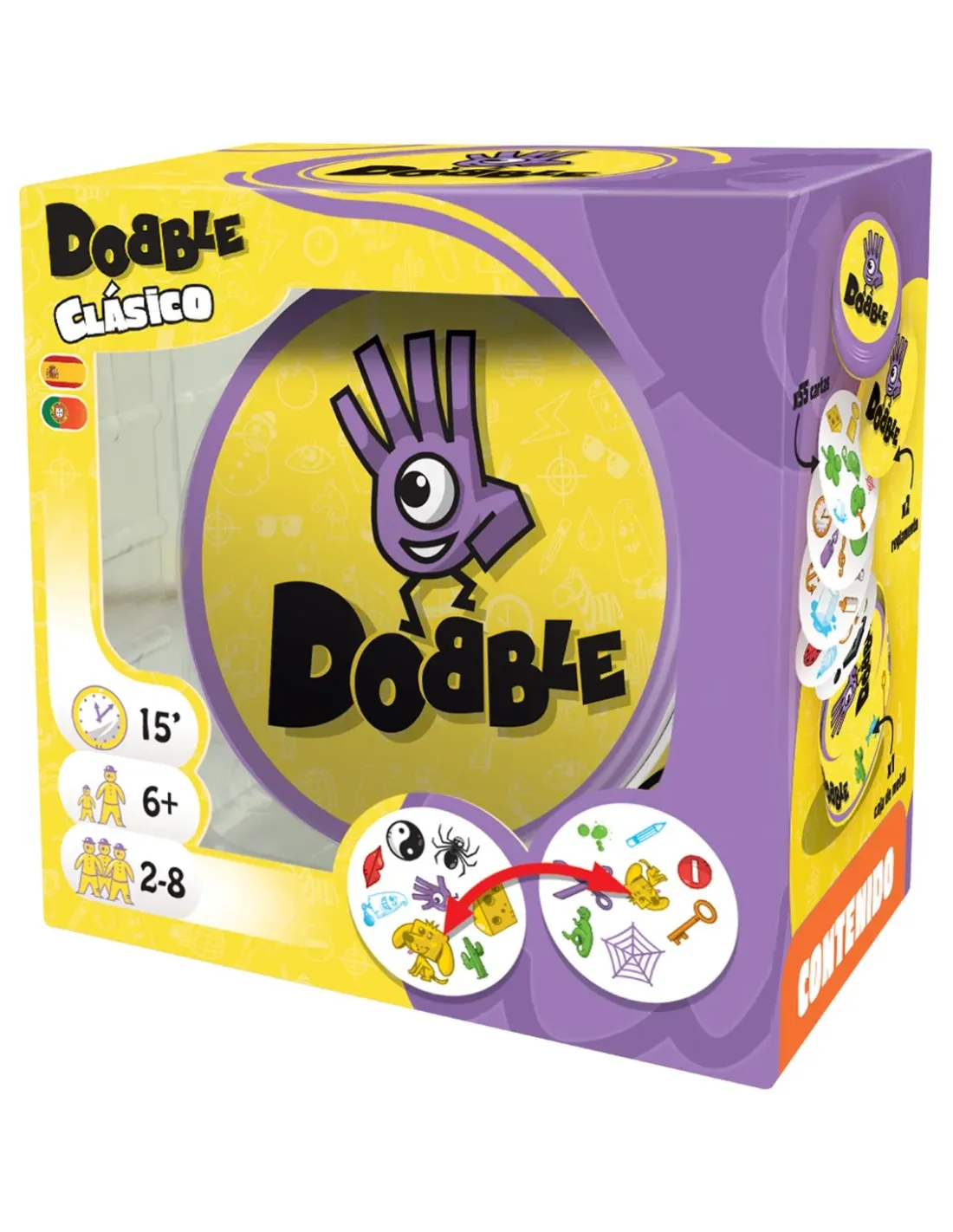 Dobble un juego con más de 50 símbolos, 55 cartas, con uno, ysolamente un símbolo idéntico entre cada carta. ¿Serás capazde descubrirlo?Si nunca habéis jugado a Dobble, coge doscartas al azar y ponlasboca arriba sobre la mesa a la vista de todos los jugadores.Buscad el símbolo idéntico en las dos cartas (misma forma ymismo color, sólo el tamaño puede variar). El primer jugador queencuentre este símbolo, lo nombra y roba dos nuevas cartasque pondrá sobre la mesa. Repetid esta operación hasta quetodos los jugadores hayan entendido que siempre haysolamente un símbolo idéntico entre dos cartas ¡Y ya está!sencillo, ¿verdad?Pues ahora prepárate, porque Dobble contiene varios mini-juegos, cada cual más divertido e hilarante, aunque el objetivosiempre es el mismo: ser el más rápido, ya que todos losjugadores juegan a la vez.Fecha de lanzamiento 20/11/2020Editorial ZygomaticCategoría Juego de CartasColección DobbleIdioma Español/PortuguesEdad mínima recomendada 6 añosNúmero de jugadores 2 a 8