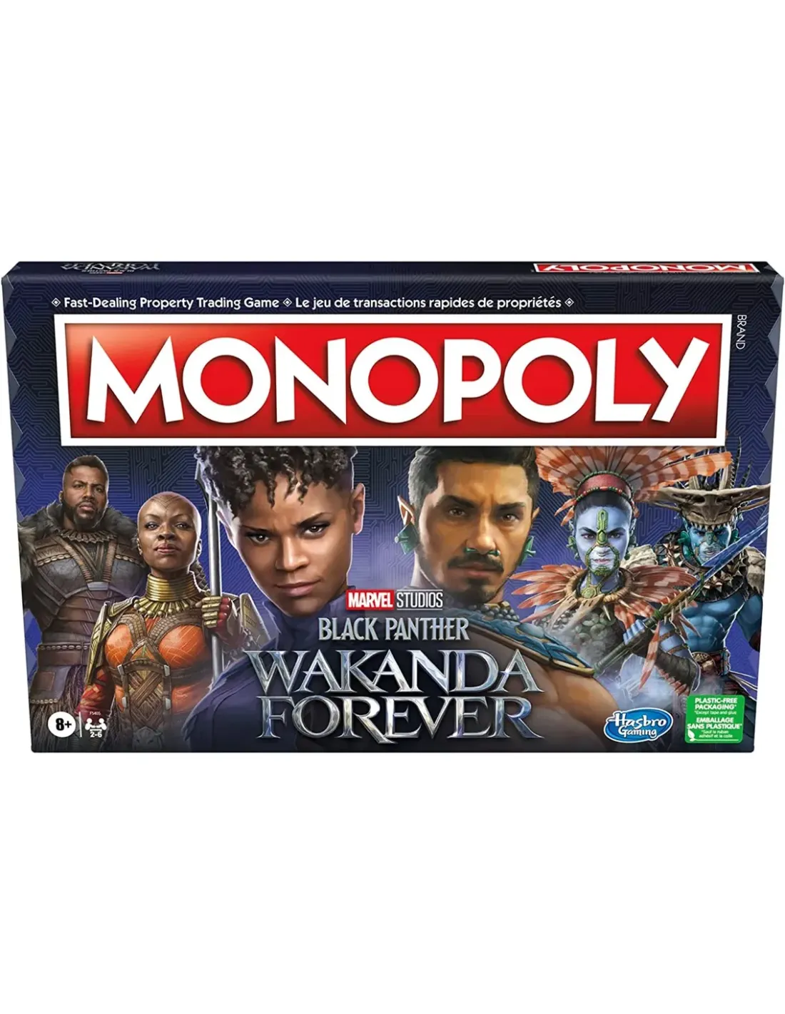 Juego de mesa para mayores de 8 años: los jugadores eligen un lado eneste emocionante juego de mesa Monopoly para los fans de Black Panther.Juega en el lado de los Wakandans o el Talokanil en un choque épico entierra y marFichas de monopolio de zinc personalizadas: los jugadores eligen una fichade color plateado para jugar en el lateral de los Wakandans, o una ficha decolor dorado si están apoyando el TalokanilBatalla por vibrano: en este emocionante juego Monopoly, los jugadorescorren para controlar ubicaciones clave y añadir edificios para girar lamarea de la batalla. El último jugador con Vibranium cuando todos losdemás perdieron la suya ganaDivertido juego de mesa familiar: reúne a la familia y amigos para jugarMonopoly: Marvel Studios Black Panther: Wakanda Forever. Es ideal para lanoche de juegos familiares y es un regalo impresionante para los fans deBlack Panther