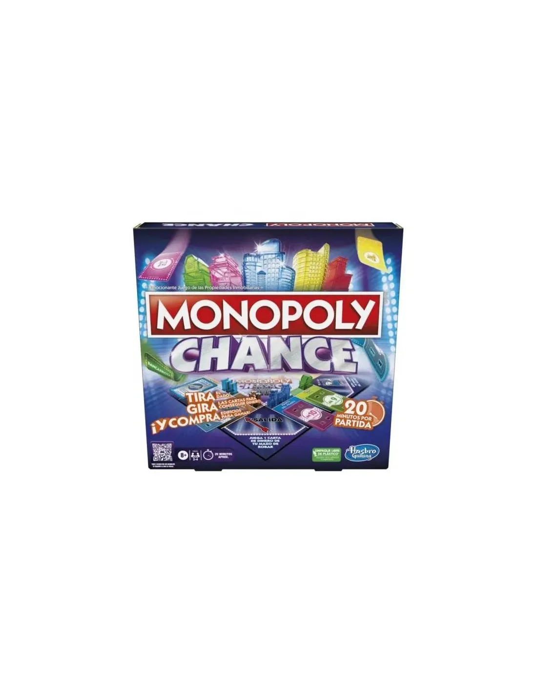 ¡Juégatelo todo con una carta! El juego Monopoly Chance es un juego donde tu suerte dependerá de las cartas y cuyas partidas duran 20 minutos aproximadamente En lugar de mover un peón por el tablero, cada jugador recibe un mazo de cartas de Dinero, cartas de Bancarrota y cartas estratégicas que dan ventaja. Tira el dado y da la vuelta hasta esa cantidad de cartas. Juega de forma segura y da la vuelta a menos cartas de lo sacado en el dado o arriésgalo todo para ganar mucho dinero. ¡Pero cuidado! Dar la vuelta a una carta de más puede significar que te toque una carta de Bancarrota. Los jugadores compran propiedades del tablero poniendo cartas de Dinero sobre las casillas de propiedades o sobre las cartas de Dinero de otros jugadores. Al final de una ronda, los jugadores que hayan puesto la última carta sobre las propiedades serán los dueños de esas propiedades y podrán añadir uno de los edificios a su calle de edificios. ¡El jugador que tenga la mayor calle de edificios al final de la partida será el ganador! Pásalo en grande en familia con este emocionante juego para adultos y mayores de 8 años.
