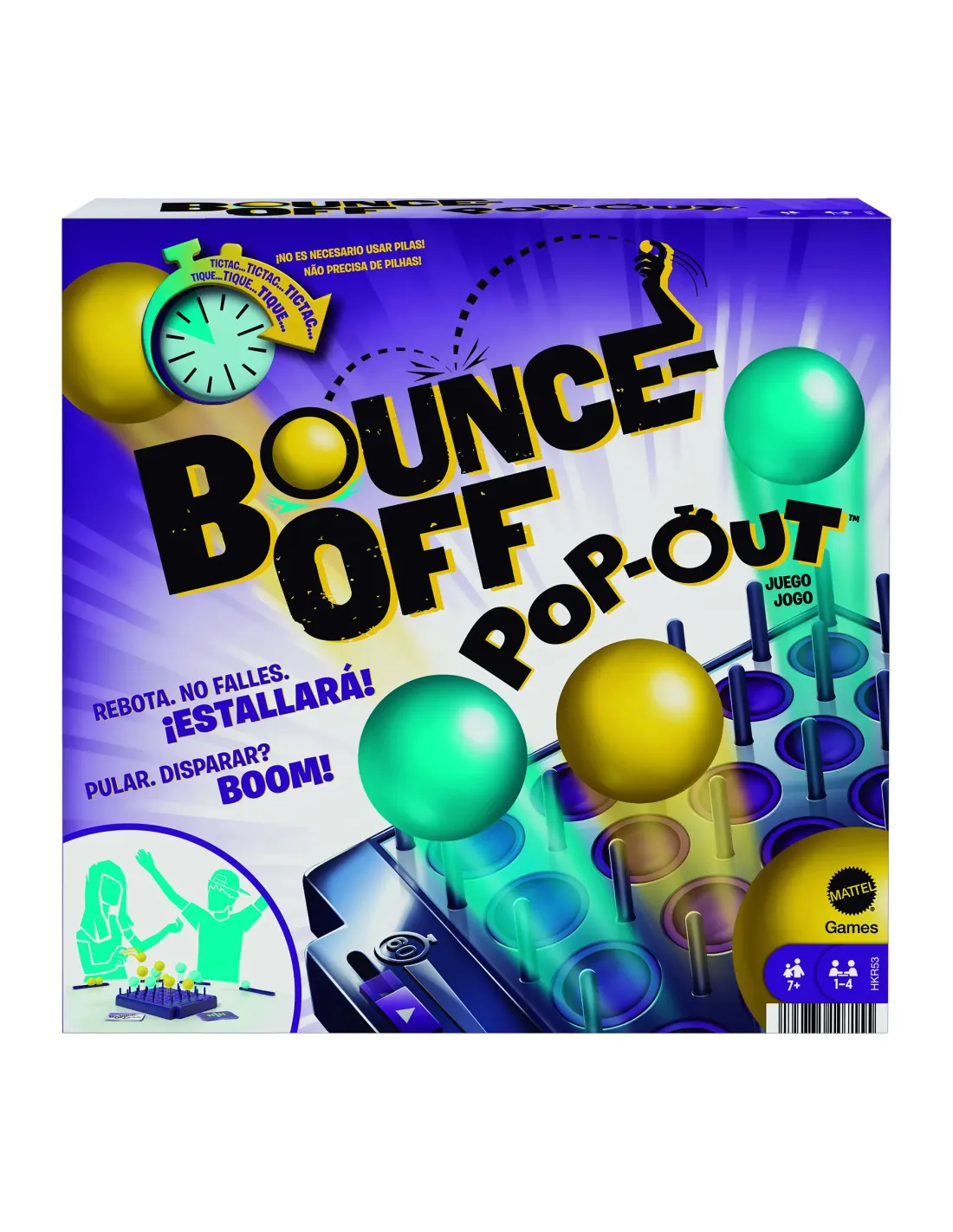 El clásico y popular reto ahora va contrarreloj con el juego Bounce-Off Pop-Out, donde esta vez los jugadores deben vencer al reloj para ganar. Juega con tus amigos o familiares y crea equipos paracompetir cara a cara. También puedes hacer que todos los jugadores colaboren botando las bolas y completando desafíos. Saca una carta, ajusta el tiempo, pulsa el botón de inicio y ¡YA! Haz que lasbolas boten y entren en la cuadrícula del juego de modo que coincidan con el patrón. Desafío completado? Hazte con la carta y grita: '¡La victoria es mía!' Te has quedado sin tiempo? Mira cómo las bolassaltan por los aires y ¡más suerte la próxima vez! Puede que la ronda se haya terminado, pero la batalla acaba de empezar. Este activo juego tanto para adultos como familias hace que cualquier fiesta onoche de juegos sea increíblemente divertida. Los colores y la decoración pueden variar.¡Encaja las bolas o pillarán un gran rebote en el rápido y divertido juego de mesa Bounce-Off Pop-Out!Saca una carta de desafío, ajusta el tiempo, pulsa el botón de inicio y ¡más os vale estar listos! El tiempo se agota y hay que encajar las bolas cuanto antes.Recrea el patrón de la carta de desafío para ganar. Demasiado lento? ¡Bolas al aire!Has recreado el patrón a tiempo? Conserva la carta de desafío para conseguir un punto y poder fardar con todo el derecho.Funciona sin pilas. Las reglas son sencillas. Poner el juego a punto es sencillo, para que puedas jugar una y otra vez.