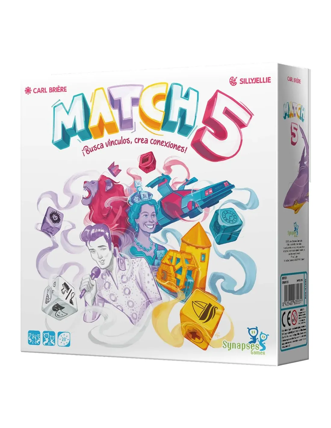 ¡Busca vínculos, crea conexiones!, ¡Más de 3000 combinacionesposibles! En Match 5, tendrás que encontrar un vínculo común entre2 palabras o grupos de palabras. Dispondrás de 3 minutos parausar la imaginación y dar con un vínculo para cada una de las 10combinaciones de dados.Inventa respuestas que conecten los símbolos de los dados. ¡Intentaque tus respuestas coincidan con las de tus amigos para conseguirmás puntos! ¡Existen miles de combinaciones posibles!CONTENIDO10 dados únicos10 tablas de palabras1 bloc de notas1 reloj de arena1 reglamentoTítulo Match 5Fecha de lanzamiento 05/11/2021Editorial Synapses GamesCategoría Juego de tableroColección Match 5Idioma EspañolEdad mínima recomendada 10 añosDuración 30'Número de jugadores 2 a 8