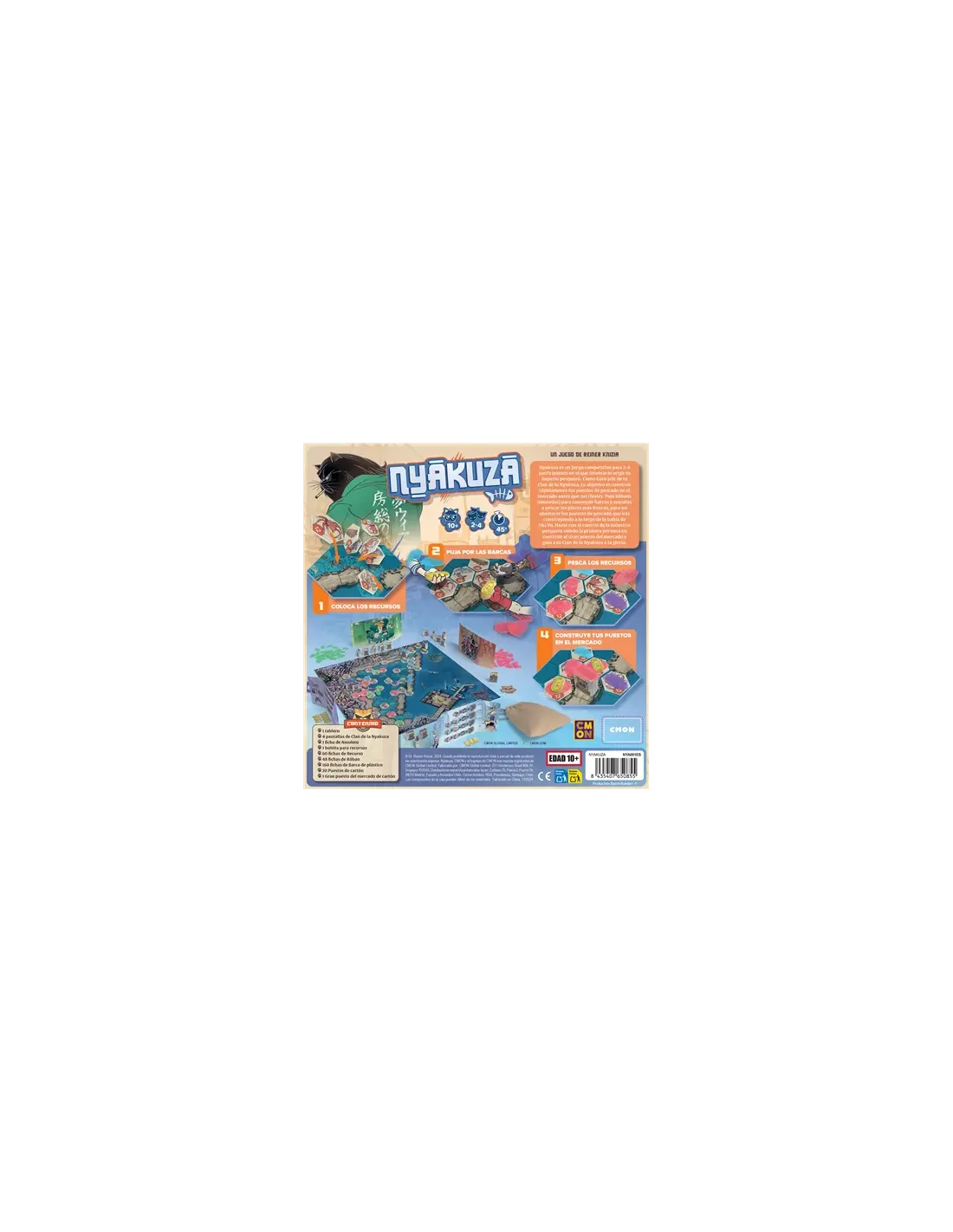 Características del juego de mesa NyakuzaNyakuza es un juego de mesa competitivo diseñado por el reconocido autor Reiner Knizia. Pensado para 2 a 4 jugadores y con una duración aproximada de 40 minutos, este título te pone en la piel de un gato jefe de Clan, compitiendo por el control del comercio pesquero en la bahía de Oki-Yo. Una propuesta ideal para amantes de los juegos de estrategia con mecánicas de subastas, colocación de recursos y control de área.Conquista el mercado con tu clan NyakuzaEn *Nyakuza*, deberás construir tu imperio pesquero paso a paso: pujando con monedas koban para conseguir barcas, pescando recursos valiosos y levantando puestos de pescado en ubicaciones clave. Cada decisión cuenta, ya que el primero en construir el Gran Puesto del Mercado se alzará con la victoria. Todo ello con una temática original y una estética felina que destaca sobre el tablero.Juego competitivo con mecánicas de subasta y colocación de recursosAmbientación original: mafias de gatos en la industria pesqueraIdeal para sesiones de juego de 40 minutos y grupos de 2 a 4 personasComponentes de alta calidad y diseño cuidadoEl juego incluye un completo conjunto de componentes de cartón y plástico, con pantallas individuales para cada Clan, fichas de recurso, monedas y barcas. Todo presentado con el sello de calidad de CMON, garantizando durabilidad y una experiencia de juego inmersiva desde la primera partida.1 tablero de juego a todo color4 pantallas de Clan de la Nyakuza160 fichas de Barca de plástico60 fichas de Recurso y 48 fichas de Koban20 Puestos y 1 Gran puesto del mercado (cartón)1 ficha de Amuleto y 1 bolsita para recursosUn juego para toda la familia con alma estratégicaCon reglas accesibles pero una gran profundidad táctica, *Nyakuza* es perfecto tanto para familias como para jugadores experimentados. Su combinación de azar controlado, toma de decisiones y competencia directa lo convierte en una opción muy atractiva dentro del catálogo de juegos modernos.Edad recomendada: a partir de 10 añosDuración aproximada: 40 minutos por partidaNúmero de jugadores: de 2 a 4Otras especificacionesAutor: Reiner KniziaEditorial: CMONCategoría: Juego de tableroColección: NyakuzaIdioma: EspañolReferencia: NYA001ESFecha de lanzamiento: 14/11/2025EAN: 8435407650855