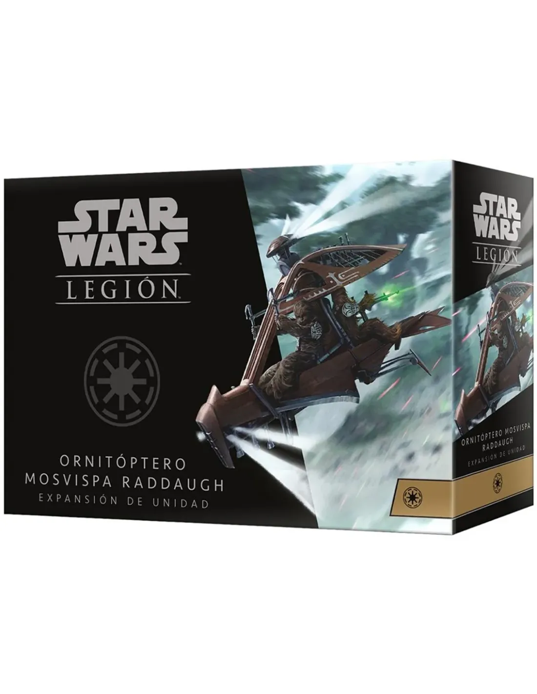 El ornitóptero Mosvispa Raddaugh es una compacta aeronave dereconocimiento usada para patrullar los densos bosques de árboleswroshyr que cubren Kashyyyk. Como la criatura que le presta su nombre, laMosvispa es veloz, letal y posee un peligroso aguijón. Ya sea hostigando alenemigo con fuego de ballestas láser o arrojando certeras granadas, elornitóptero es un adversario formidable. Este pack de expansión para STARWARS: LEGIÓN contiene 1 miniatura de Ornitóptero Mosvispa Raddaughesculpida con todo lujo de detalle, suficiente para desplegar una unidadPesada, además de nuevas cartas.CONTENIDO1 miniatura de plástico 3 cartas de Unidad 3 cartas de Mando 6 cartas deMejora 13 fichas diversas 1 hoja de reglasTítuloSW Legión: Ornitóptero Mosvispa RaddaughEditorialAtomic Mass GamesColecciónStar Wars LegionIdiomaEspañolEdad mínima recomendada14 añosDuración1-2 H.Número de jugadores2