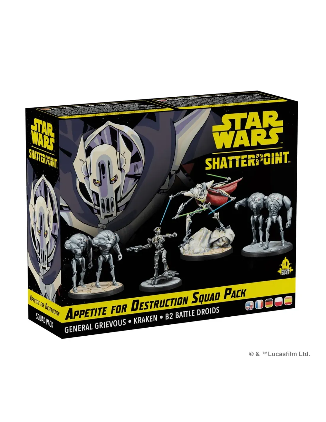 HAMBRE DE DESTRUCCIÓN - PACK DE ESCUADRA GENERAL GRIEVOUS¡El infame general Grievous aterroriza a la República! Desplegando el ejército droide de los separatistas por toda la galaxia, Grievous ha demostrado ser un formidable rival para sus adversarios jedi.Astuto estratega militar, emplea tácticas brutales para obtener numerosas victorias e infundir miedo a sus oponentes. Su reputación queda aún más reforzada por destreza marcial. Entrenado por elmismísimo conde Dooku, Grievous esgrime con letal eficiencia sables de luz arrebatados a sus enemigos caídos. Sus mejoras cibernéticas potencian aún más sus habilidades, convirtiendo a Grievousen una pieza clave para las esperanzas separatistas de derrocar a la República...CONTENIDO3 cartas de postura de unidad, 3 cartas de órdenes de unidad, 3 cartas de perfil de unidad, 4 miniaturas.Título Appetite for Destruction Squad PackReferencia SWP05Fecha de lanzamiento 14/07/2023Editorial Atomic Mass GamesCategoría Juego de MiniaturasColección Star Wars ShatterpointIdioma Español/Alemán/Inglés/Francés/PolacoEdad mínima recomendada 14 añosDuración 90'Número de jugadores 2